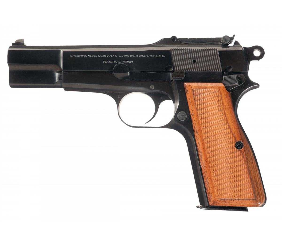 Manufactured in Belgium in 1968 with a drift adjustable front sight and a tangent rear sight calibrated to 500 meters. There were only 7,000 imported between 1965 and 1978. Has the standard markings and features of the T Series Hi-Power. Fitted with checkered walnut grips with a smooth outside border.