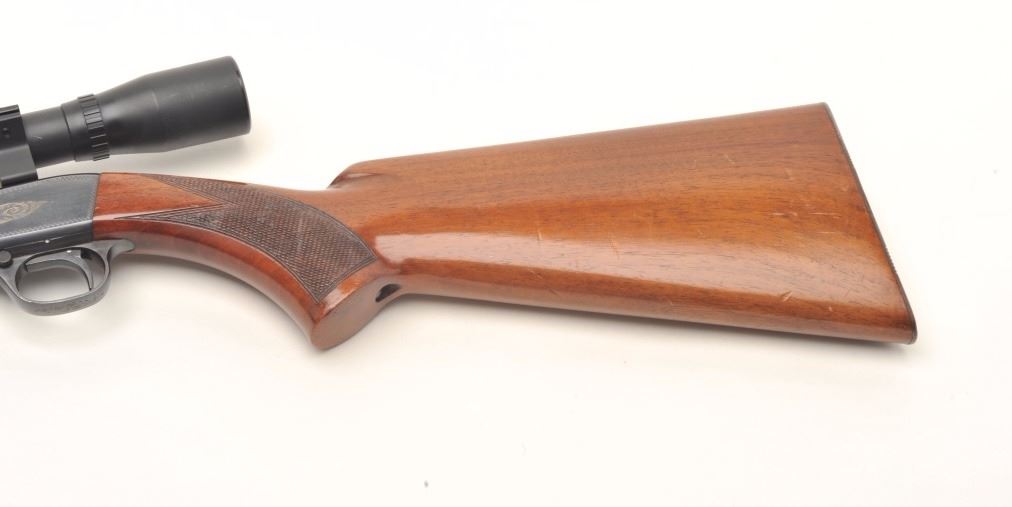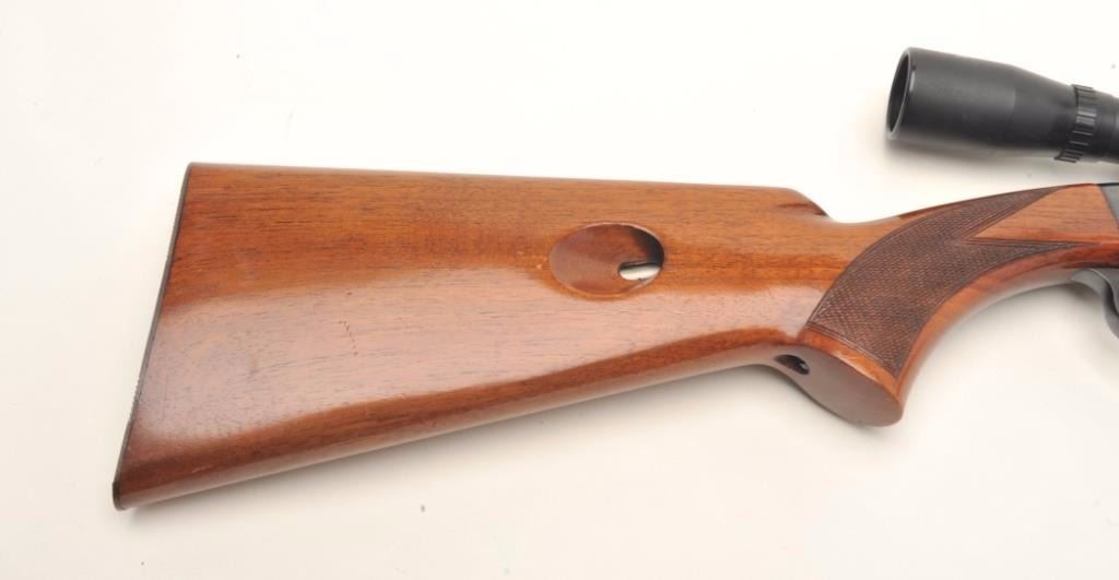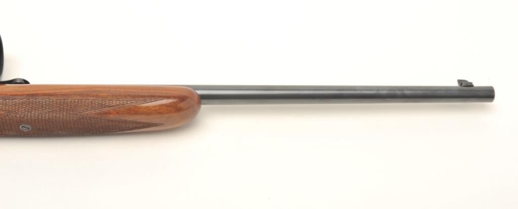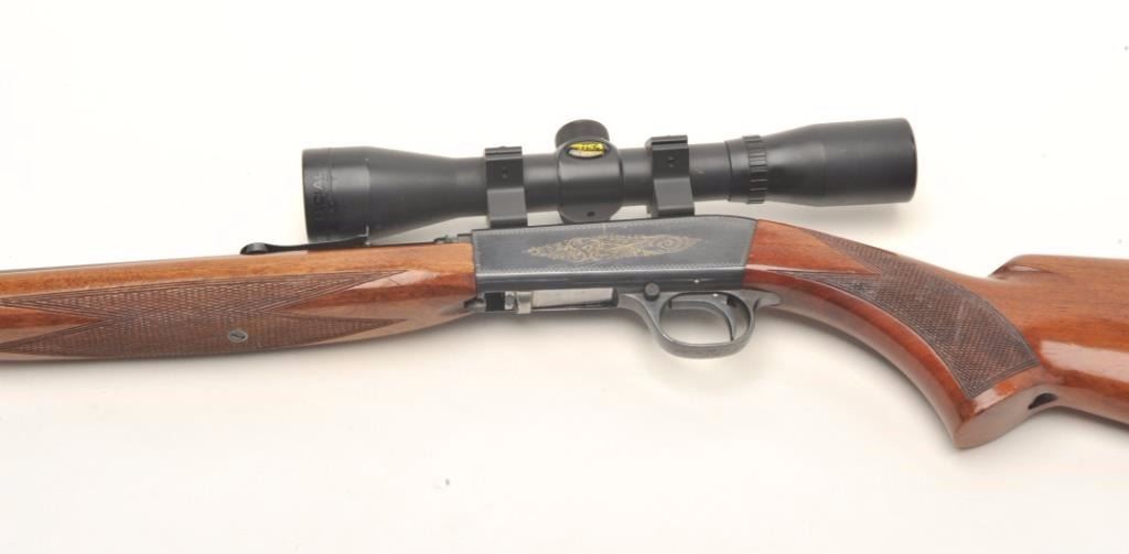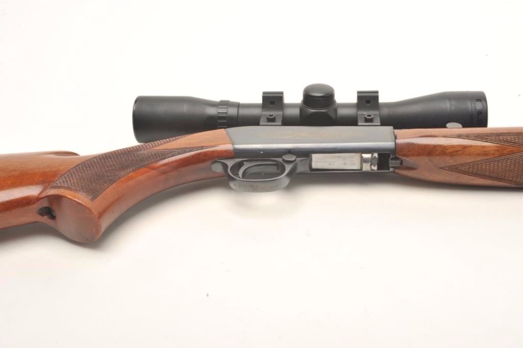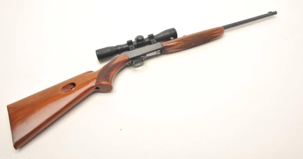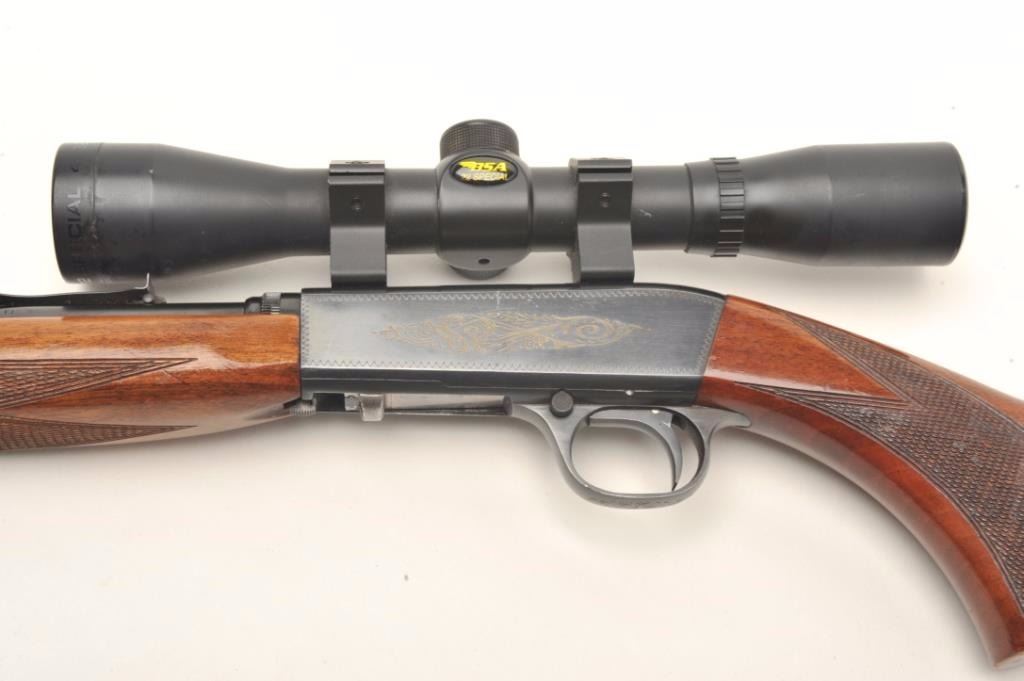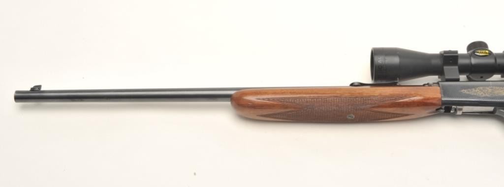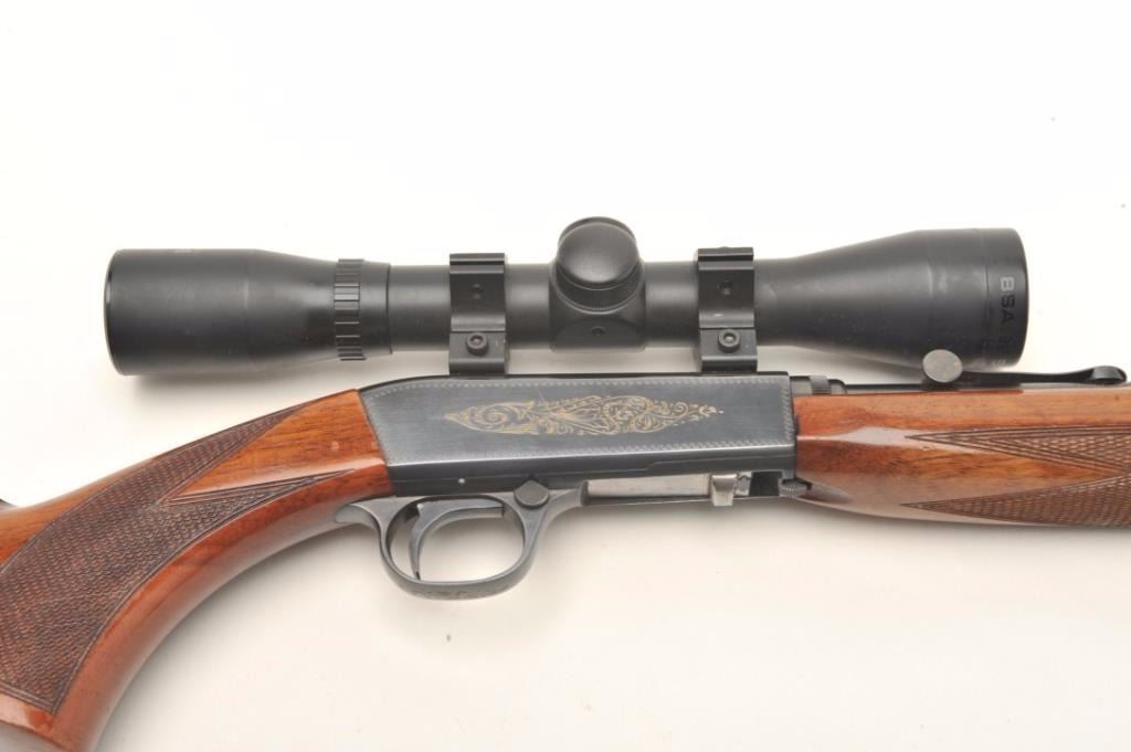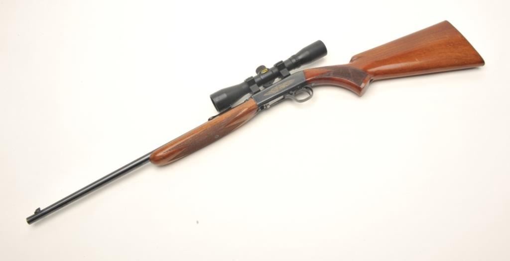Belgian Browning semi-automatic rifle, .22 Long Rifle caliber, serial #17160. The rifle is in very good overall condition with a 20” barrel. The barrel retains nearly all of its blued finish with only light handlingmarks noted. The receiver shows the majority of its blued finish and is embossed with gold trim. The checkered wood stocks are in very good condition with small mars and handling marks. The butt stock ends with acheckered steel butt plate. The rifle is topped with a two-piece scope mount and a BSA 4 x 32 fixed power scope. The bore is very good, the action crisp and markings sharp on this desirable Belgian made Browning. Est.: $250-$500.