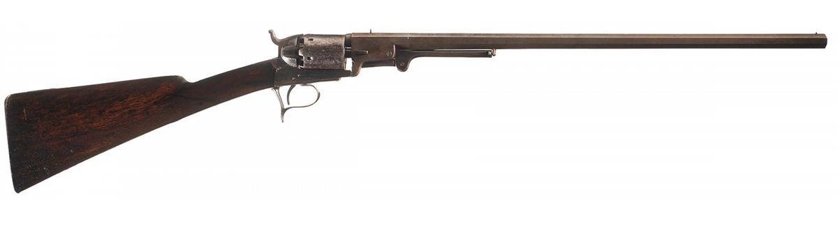 Manufactured mainly in Belgium, the term "Brevete" can be applied to any revolver made in Europe under license by Colt using one or more of their patents. The frame of this carbine closely resembles a Colt Dragoon pistol with a 6-shot cylinder, and the barrel is marked "COLT/BREVETE" at the breech. Fixed sights, Colt style loading lever and trigger guard with finger spur. Finished blue with a casehardened frame, loading lever and hammer. Mounted on a smooth straight grip stock with smooth shotgun style buttplate. The left side of the buttstock is faintly period marked "Cal 44-50". The serial number "1331" appears on the trigger guard with mismatched number "670" on the replacement barrel.