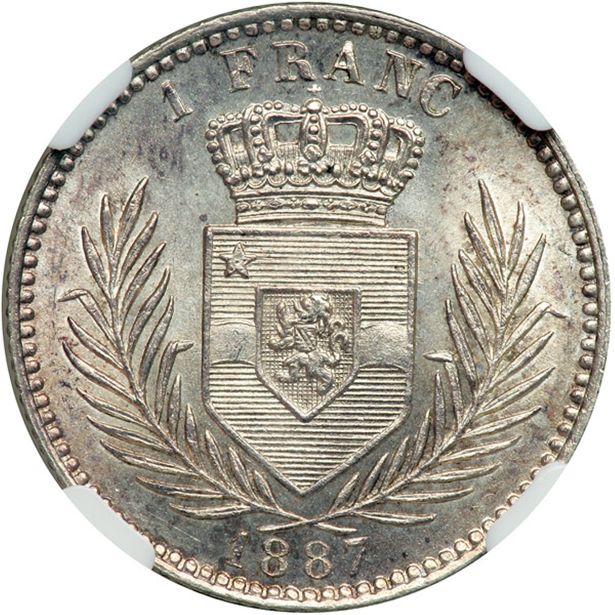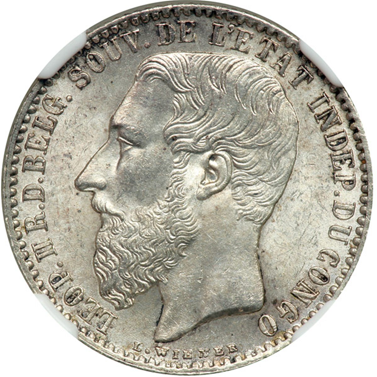 Belgian Congo. Franc, 1887. KM-6. Leopold II. Choice sharply struck example. NGC graded MS-64.