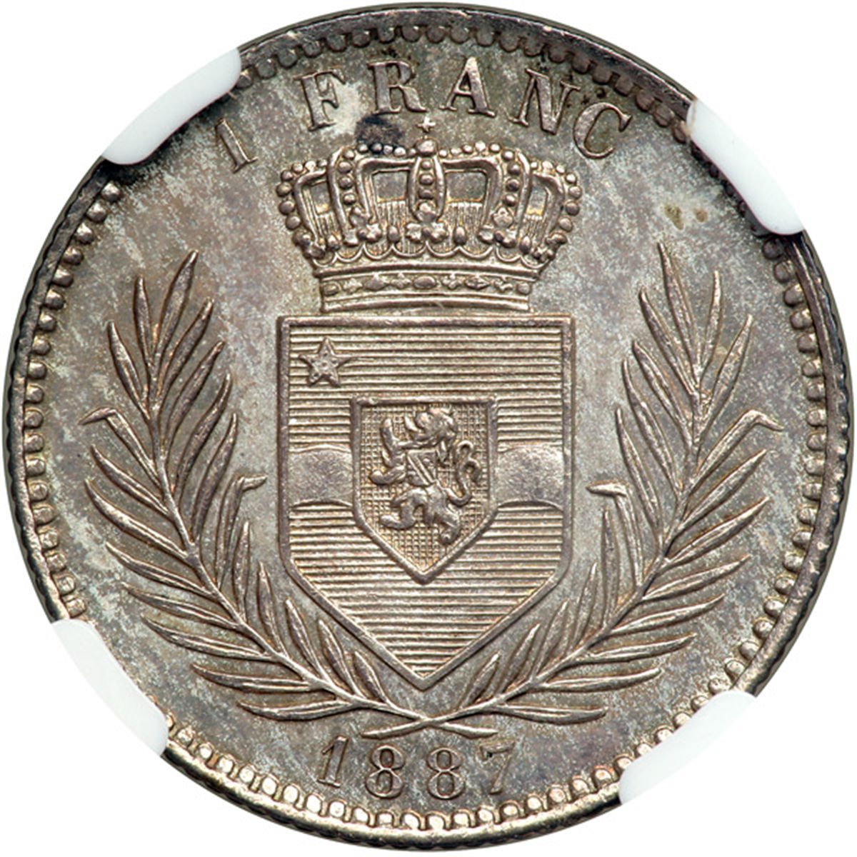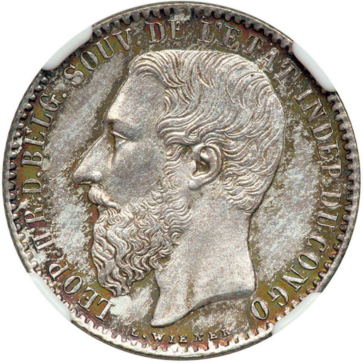 Belgian Congo. Franc, 1887. KM-6. Leopold II. Mottled toning. Uncirculated, Details (Surface Hairlines).