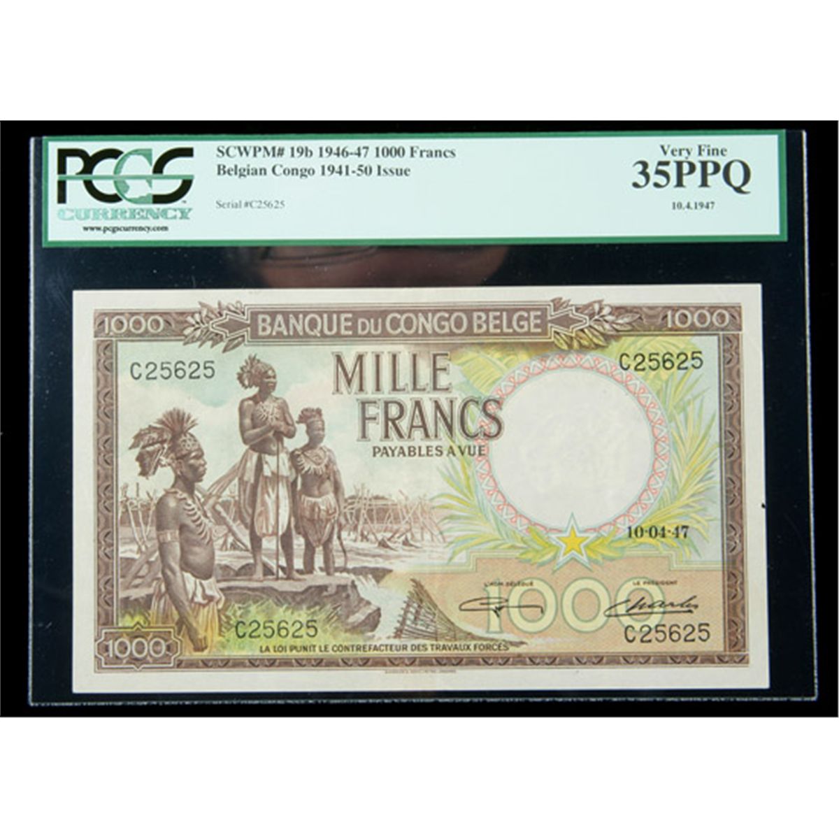 Belgian Congo SCWPM# 19b, 10.4.1947 1000 Francs. PCGS Very Fine 35PPQ. . Fr-P-19b. A stunning example of this rare note that is unlisted in the Krause reference above the "XF" grade. The colors are fresh and bright, and the moderate amount of handling from circulation is not overly distracting. A note from this issue in similar grade realized $2,530 in a Ponterio sale in January, 2009, and we would not be surprised if this note far surpassed our perhaps conservative estimate.