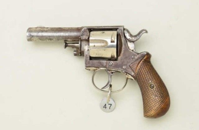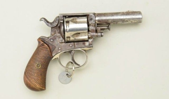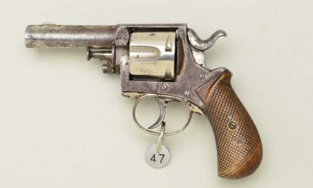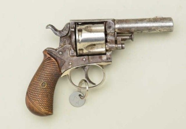 Belgian DA revolver marked “BRITISH BULL-DOG” on top strap, .44 cal., 3-1/8” barrel, nickel finish, checkered wood grips, #20. This gun is in overall good to very good condition showing approx. 25% original nickel with scattered spots of erosion and grey/brown patina, good action, bore and markings including an unusual manufacturer’s emblem on the left side of the frame of crossed barrels and “F & C”; grips shownormal wear from carry and are overall good; unusual with the longer barrel. Est.: $300-$600.
