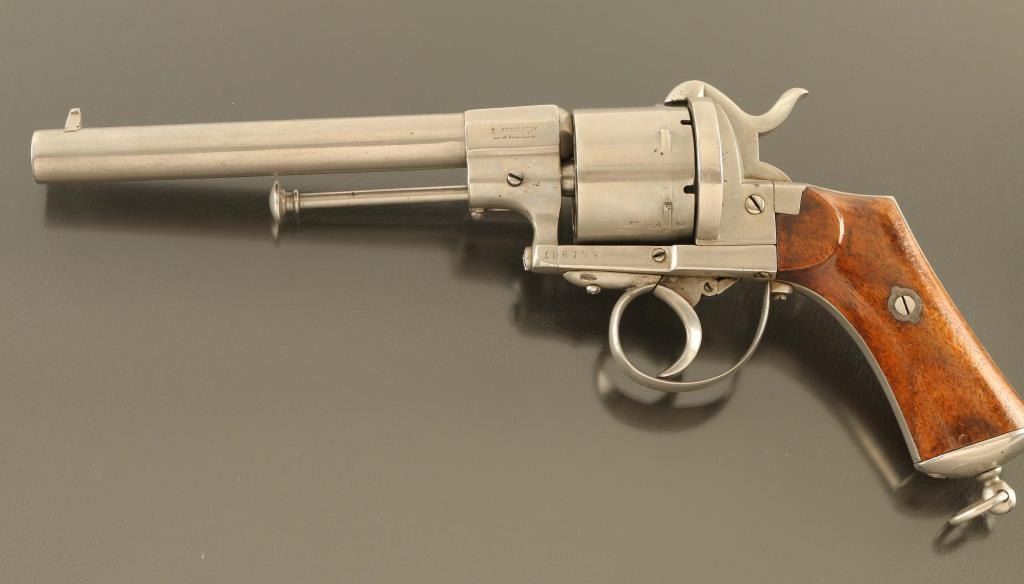 Belgian made large frame double-action-only Lefaucheux brevette pinfire revolver with an approximate 11mm bore. Features a nickel plated finish, 6 3/8 part octagonal barrel, dovetailed bead top post front sight, ‘v’ notch rear sight cut into the hammer lip, rounded trigger, knurled hammer spur, non-fluted six-shot cylinder, ejector rod, lanyard ring on the butt and smooth wood grips. Revolver retains approximately 95% of its cloudy nickel plated finish showing some scattered losses on the top of the barrel. The action is in good working order other that the trigger does not reset on its own, the bore is very good and the wood grips are very good. Condition is NRA Fine. ***Antique Firearm***