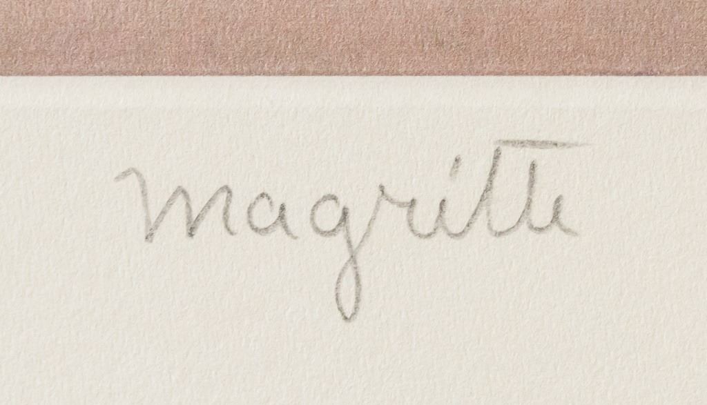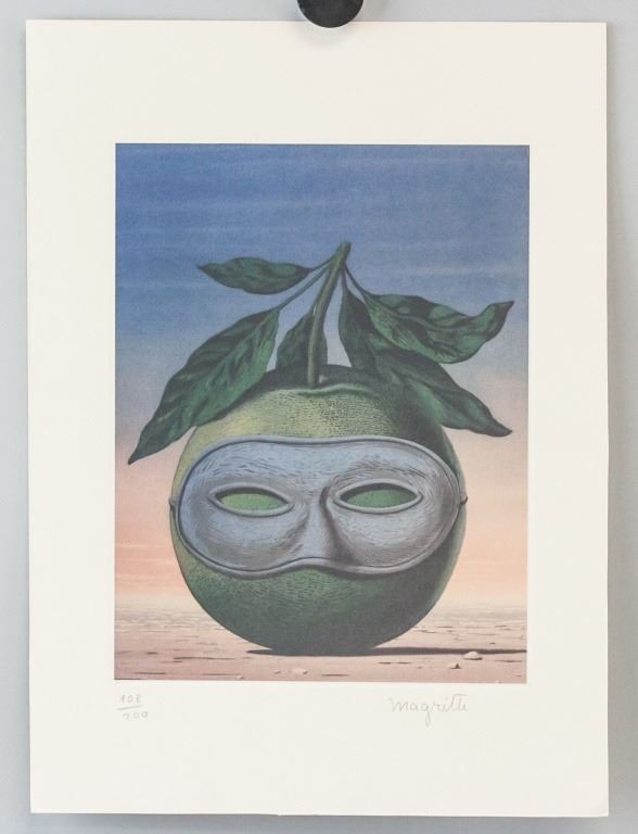 Lithograph on paper. Featuring an surrealist composition of a green apple wearing a mask. Numbered :108/200" to the bottom left. Signed "magritte" to the bottom right. Image size: 20 x 15 cm (7.75 x 6 inches). Sheet size: 29 x 21 cm (11.5 x 8.25 inches).