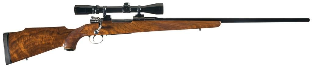 Manufactured without fixed sights, with a Burris Fullfield 3-9x scope installed on the receiver with a pair of Burris twist-off bases, a Belgian proofed bolt handle numbered "3738", and a scroll engraved floor plate with silver wire border inlays. Checkered pistol grip stock, with a fluted horn grip cap, raised shadow-line cheekpiece, and a Decelerator recoil pad.