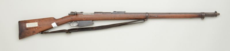 Belgian Mauser Model 1889 bolt-action rifle, “Birmingham” marked receiver, 7.65mm cal., 31” barrel, blue finish, full wood stock, leather sling, #70. This British broad arrow proofed rifle is in overall good + conditionwith a crisp action, good markings, bore may clean to good; small dent on right side of barrel half way to muzzle, overall good to very good wood; a seldom seen variation. Est.: $200-$400.
