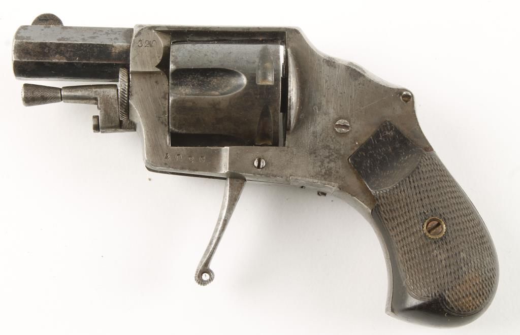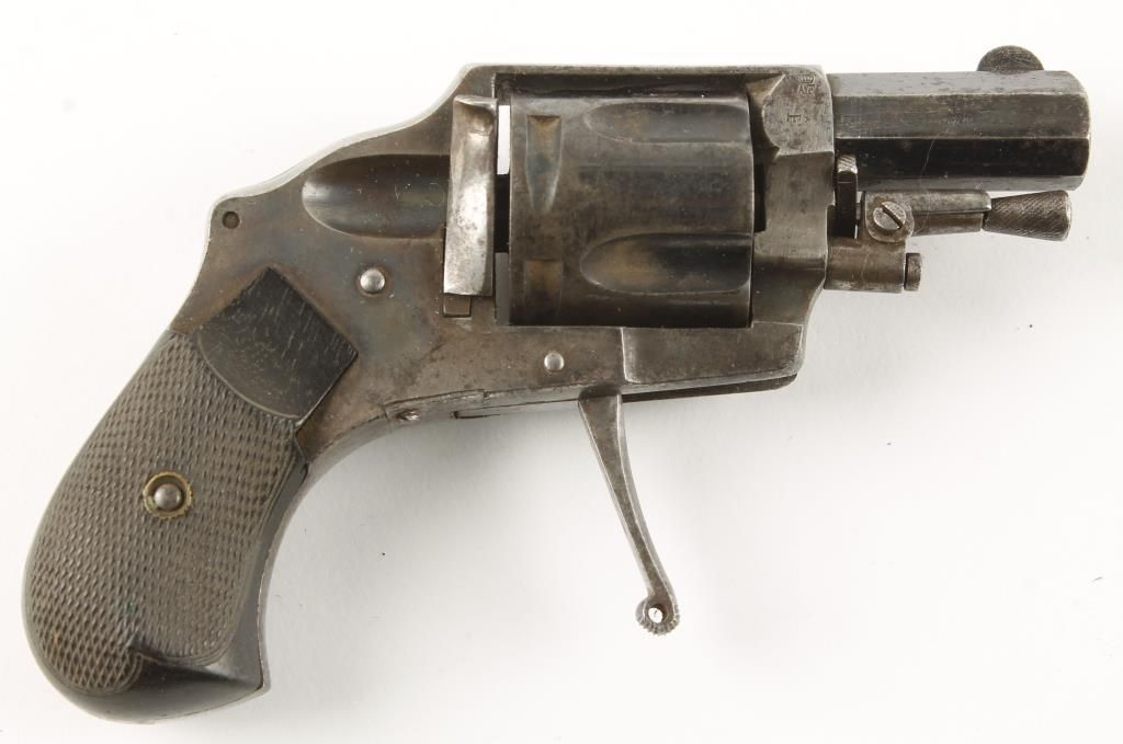 Double action folding trigger 5 shot hammerless revolver with 1-1/2" octagon barrel. Blued finish, checkered hard rubber grips and fixed sights. Top strap marked in large gold lettering "GA". Good bore and action. Condition: Fair showing little finish remaining on frame with light pitting scattered throughout and grips are good. *Curio & Relic Firearm*