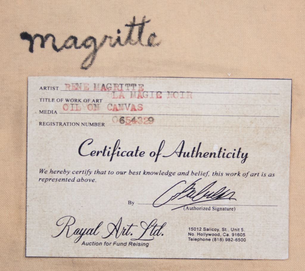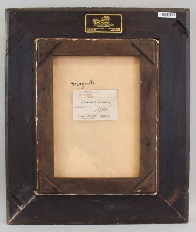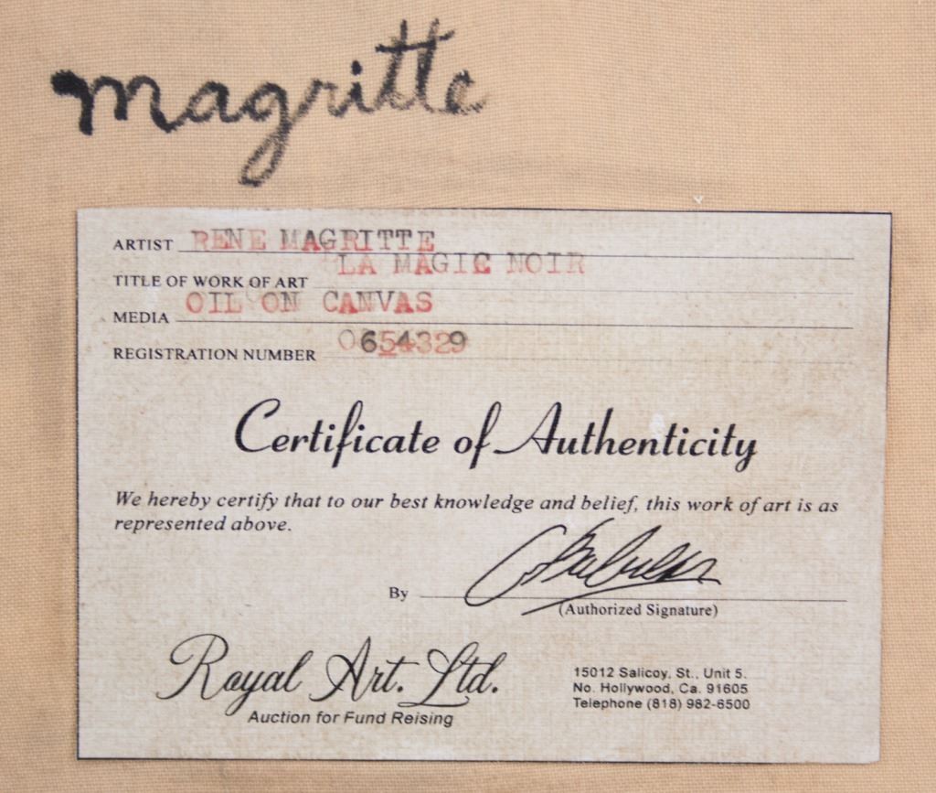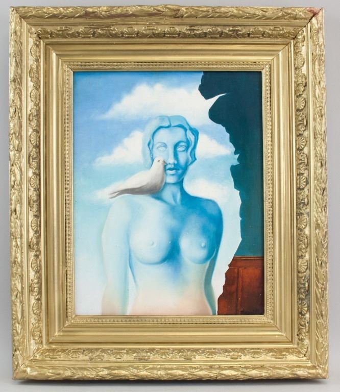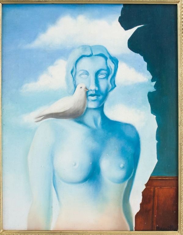 Oil on canvas, framed. Featuring surrealist composition of a woman with a blue head and torso. A white pigeon sits on her shoulder. Signed "magritte" to the bottom right corner. "magritte' inscribed on verso. Label on verso reads "ARTIST RENE MAGRITTE / TITLE OF WORK OF ART LA MAGIC NOIR / MEDIA OIL ON CANVAS / REGISTRATION NUMBER 0654329 / Certificate of Authenticity [signed]". Damaged frame. Canvas size: 38 x 30 cm (15.0 x 11.8 inches). Frame size: 54 x 46 cm (21.3 x 18.1 inches).