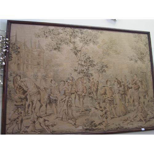 Belgian wool tapestry depicting a hunting scene. Framed in an oak frame.