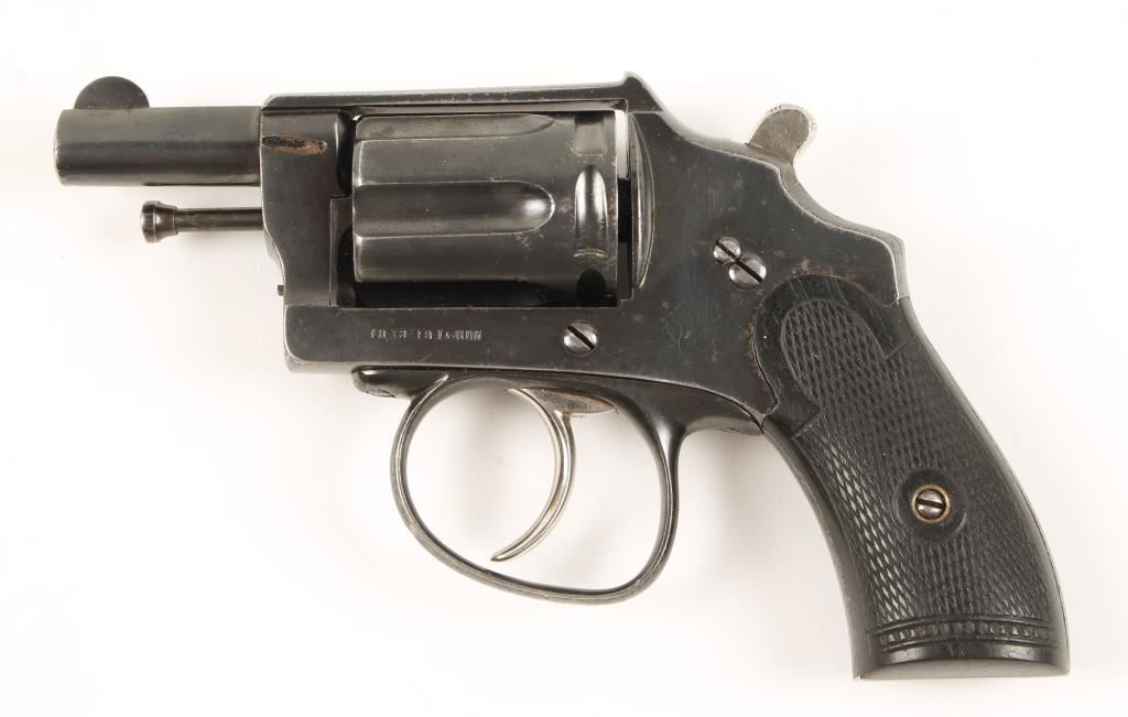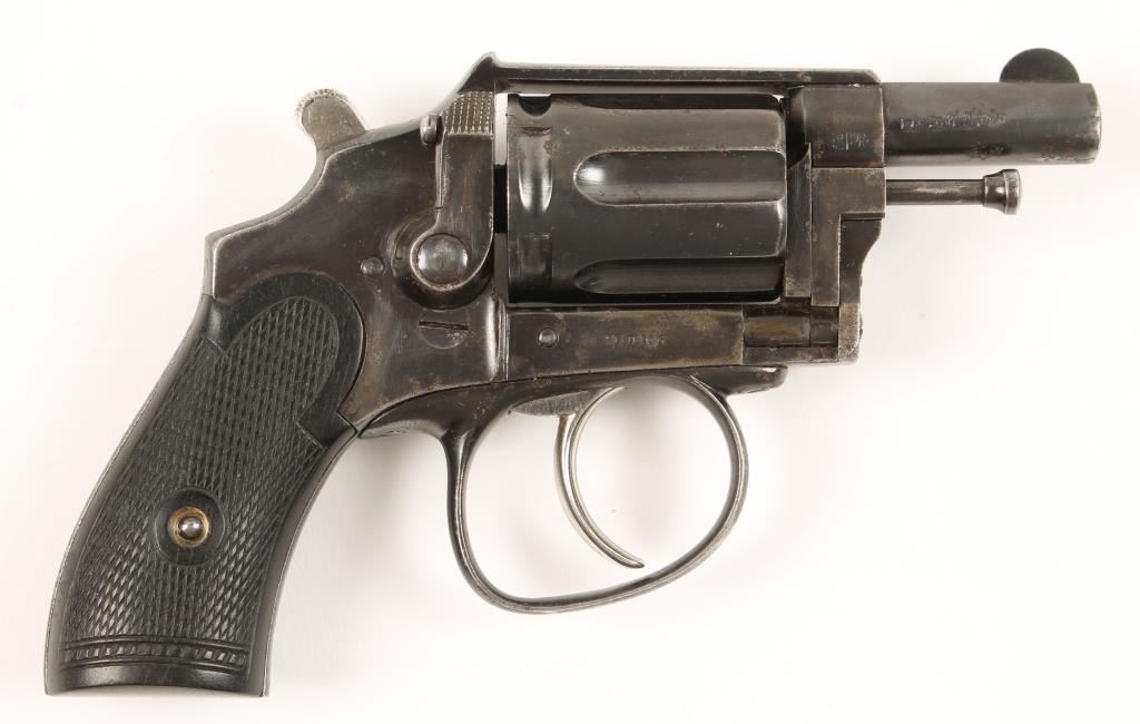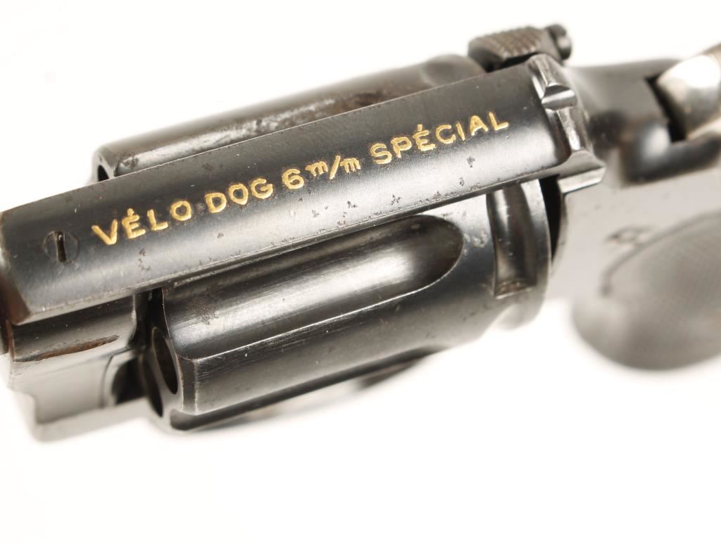Blued double-action 6-shot revolver with a 1-5/8" barrel. Finish has light edge wear and many specks of surface rust. Bore is shiny with sharp rifling and the chambers are very good. "Velo Dog 6m/m Special" is inlaid in gold on the top strap. Functions well. Grips are worn checkered hard rubber with few scratches. Condition is very good. *Modern Firearm*