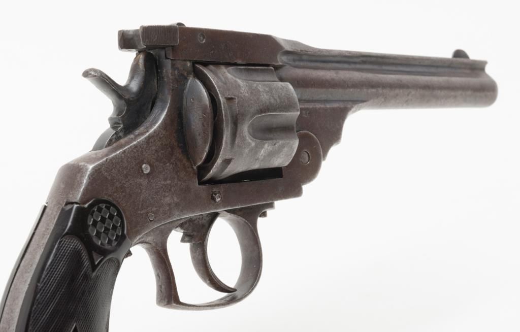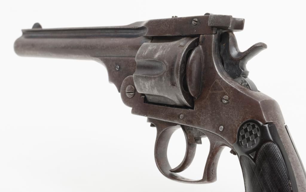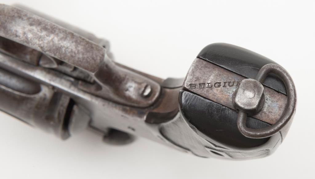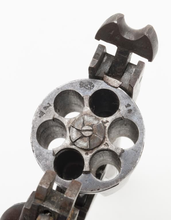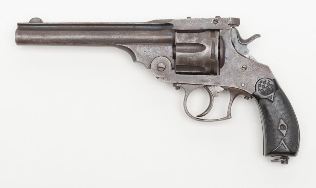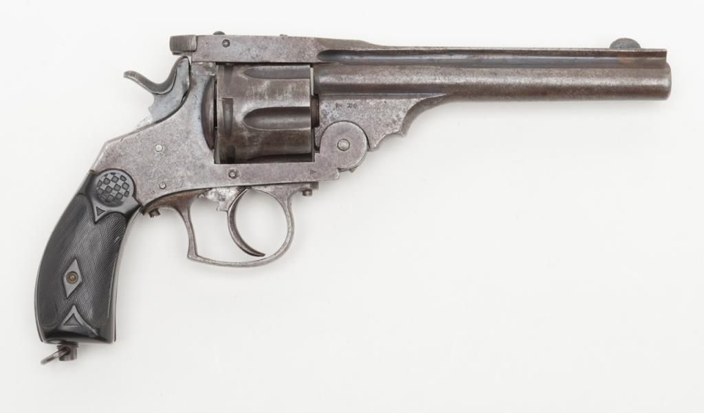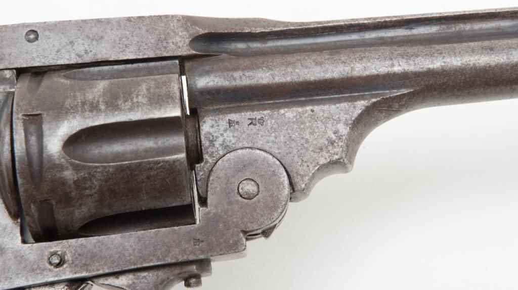 Belgian copy of a Smith & Wesson .44 DA Top Break revolver, .44 cal., 6” barrel, blue finish, checkered black hard rubber grips, lanyard ring, #14 in overall good condition showing traces of blue in protected areas, balance gone to a brownpatina with scattered pinprick pitting, good grips, action is partially working but trigger return spring is not operating. (Antique). Est.: $200-$300.