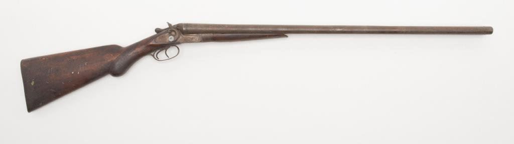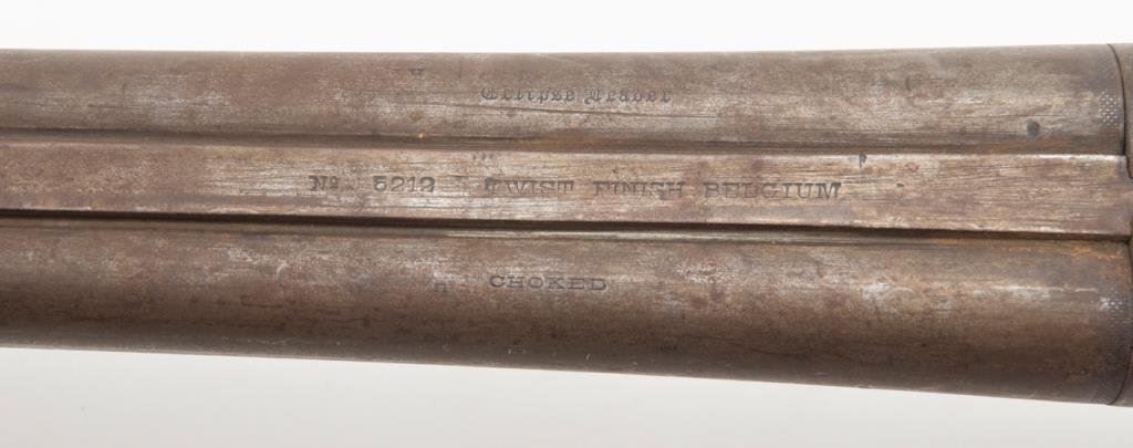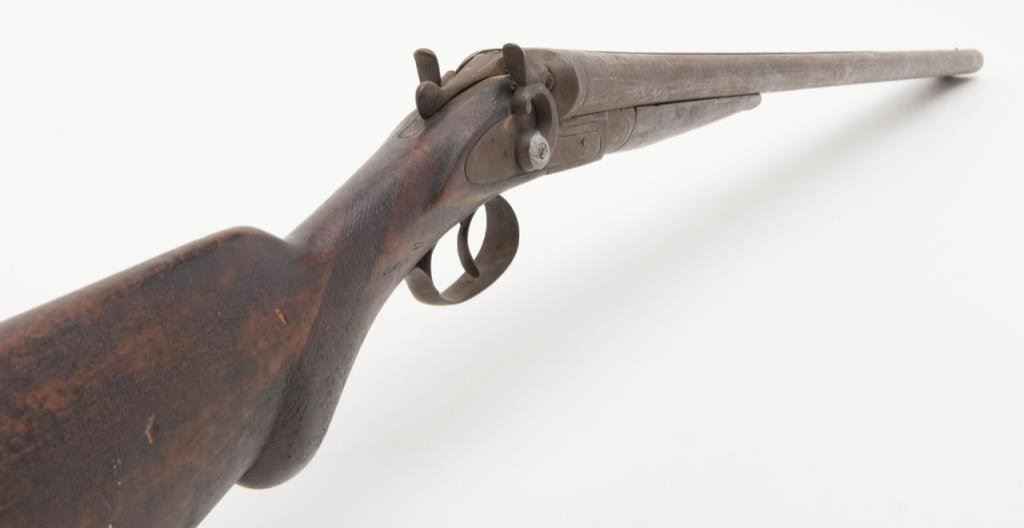 Belgian exposed hammers SxS shotgun, heavy dark patina, rough condition overall; a good wall hanger or display piece. (Antique) Est.: $100-$175.