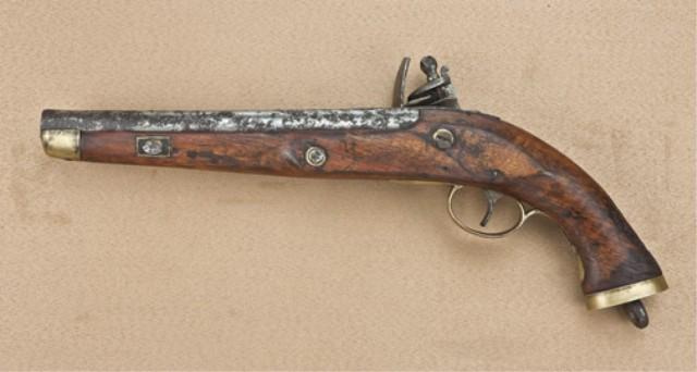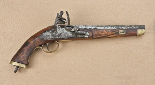 Belgian flintlock trade pistol circa mid to late 19th century, showing light to moderate pitting and erosion, stock shows refinish with slight losses at the ramrod area. Approx. .67 caliber. 16” overall. Est: $150 - $300