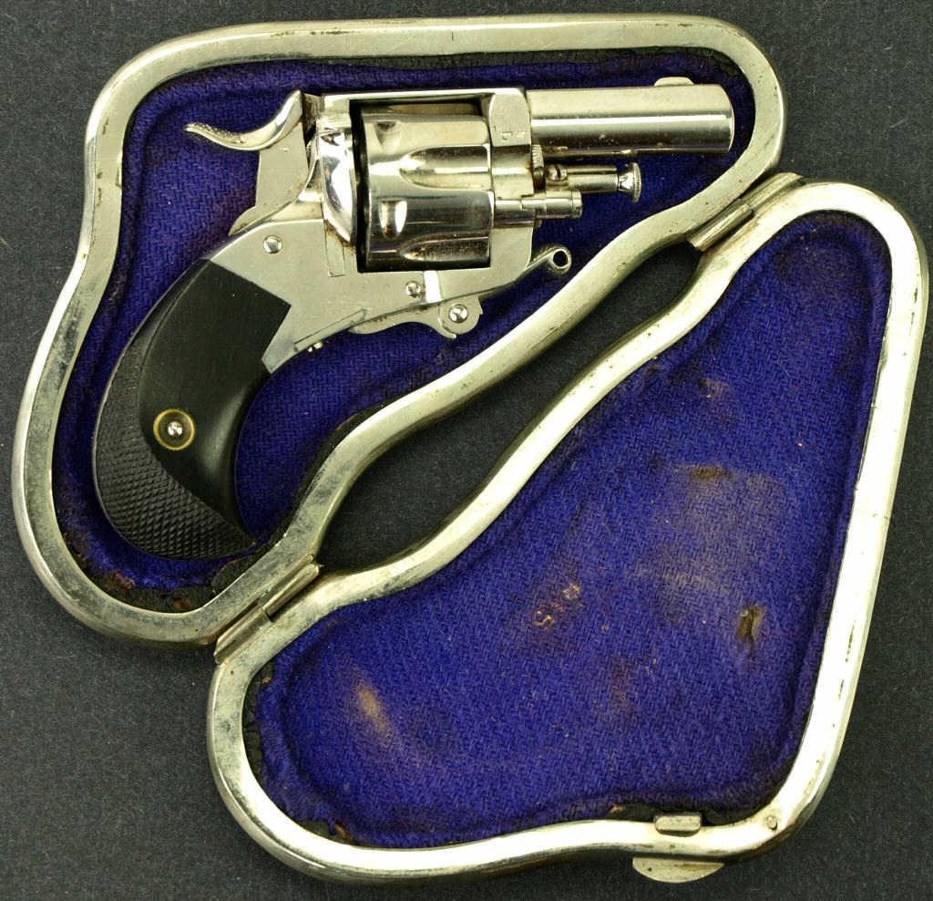 .22 cal. NVSN 6 shot revolver 1 1/2" barrel, nickel finish and fine checkered rosewood grips. Top of barrel marked "The Puppy". Revolver in fine condition. Sharp markings and bright finish with leather and lined purse holster. Good action and bore. NO FFL required.