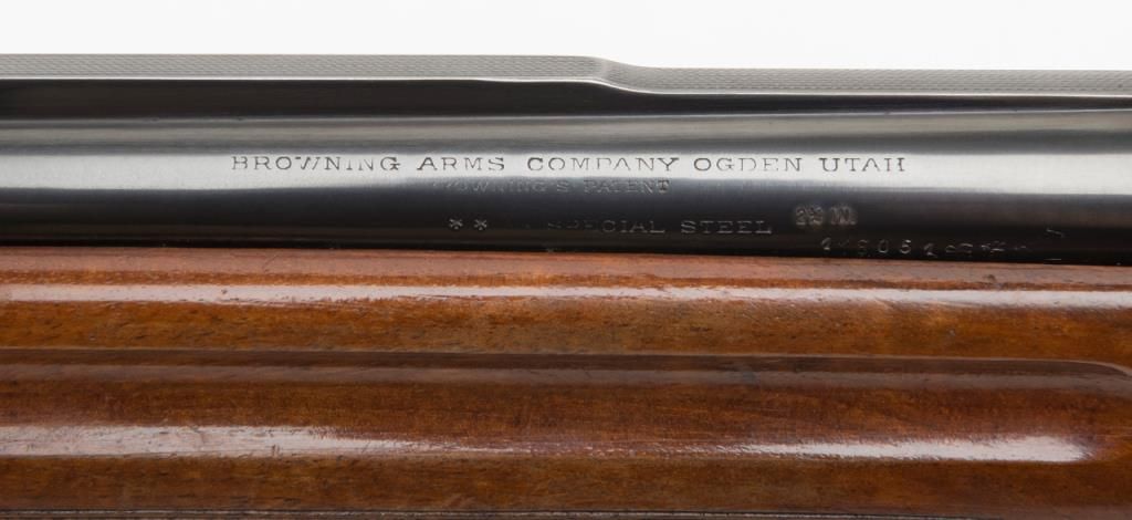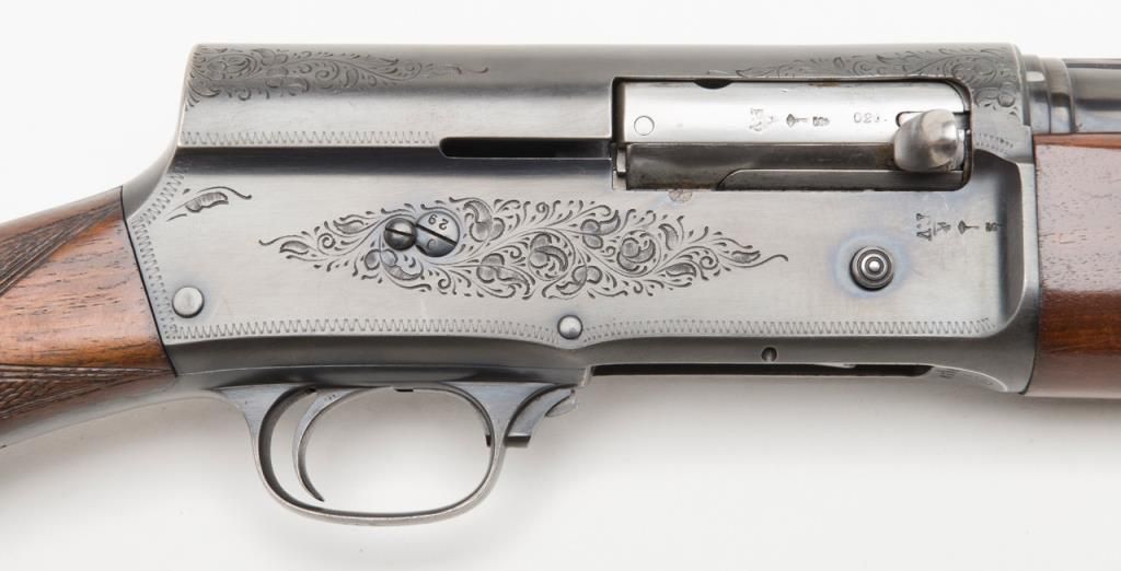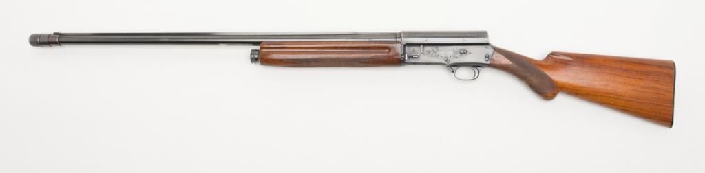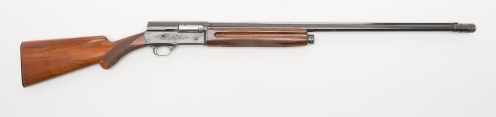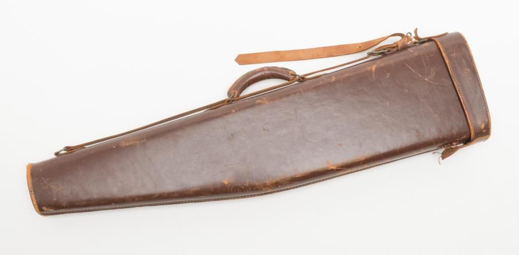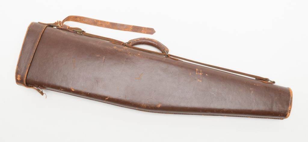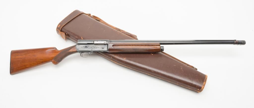 Belgian-made Browning Auto 5 semi-auto shotgun, 16 gauge, 28” barrel including adjustable muzzle choke, blue finish, checkered wood stocks, #99029 in overall very good condition showing considerable muted blue finish, very good bore,crisp action, good wood with scattered wear, scratches and mars from carry and storage; some wear and slight damage to hard rubber butt plate; with leather mutton case showing wear and scuffing, cleaning rod inside; end piece separated from body. (C&R/PPT). Est.: $300-$600.