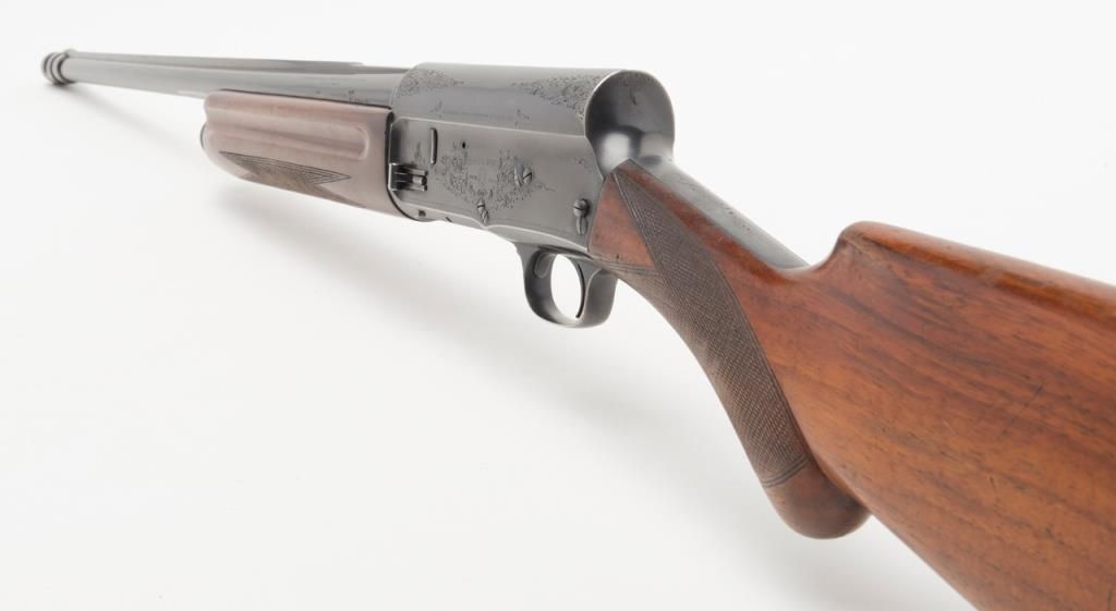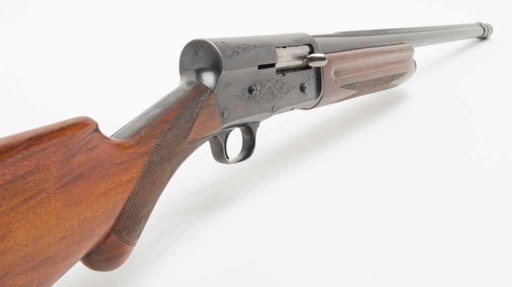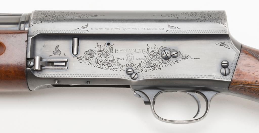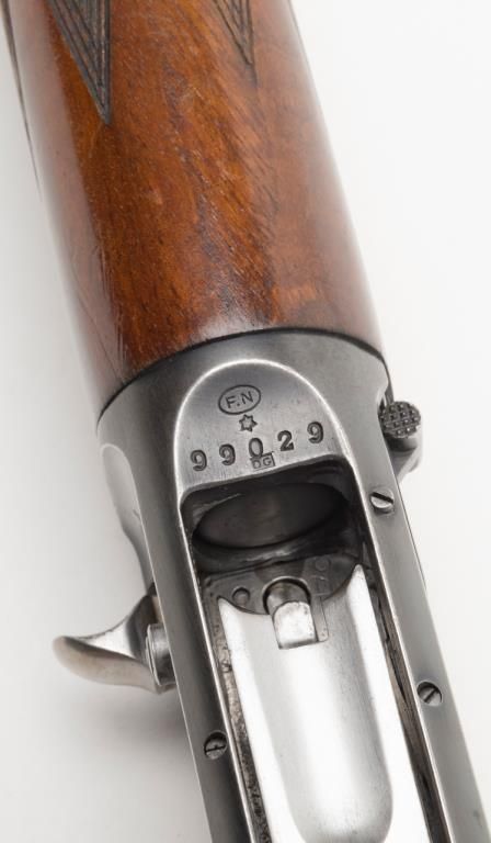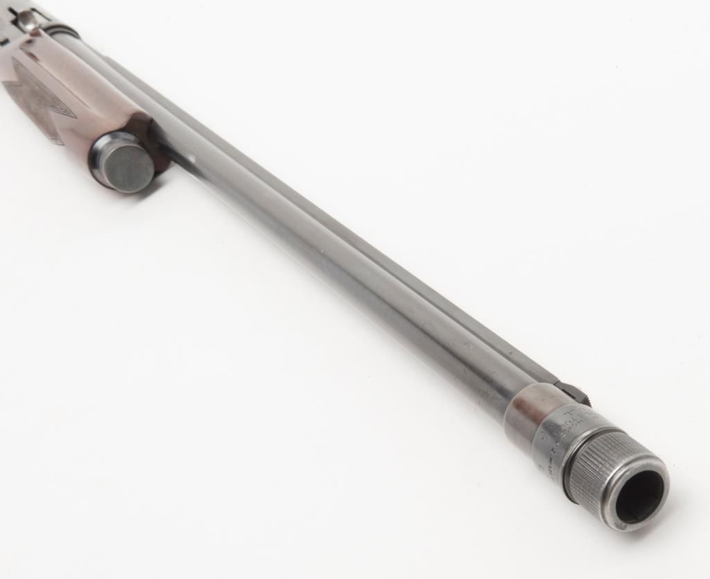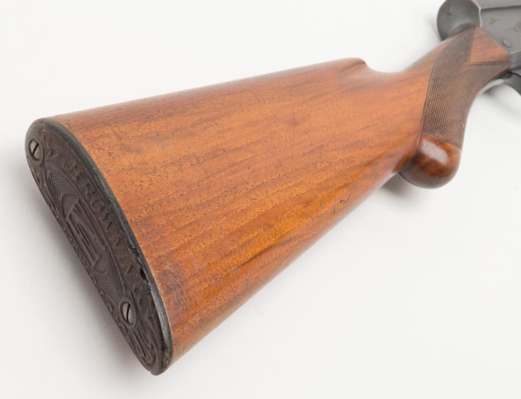 Belgian-made Browning Auto 5 semi-auto shotgun, 16 gauge, 28” barrel including adjustable muzzle choke, blue finish, checkered wood stocks, #99029 in overall very good condition showing considerable muted blue finish, very good bore,crisp action, good wood with scattered wear, scratches and mars from carry and storage; some wear and slight damage to hard rubber butt plate; with leather mutton case showing wear and scuffing, cleaning rod inside; end piece separated from body. (C&R/PPT). Est.: $300-$600.