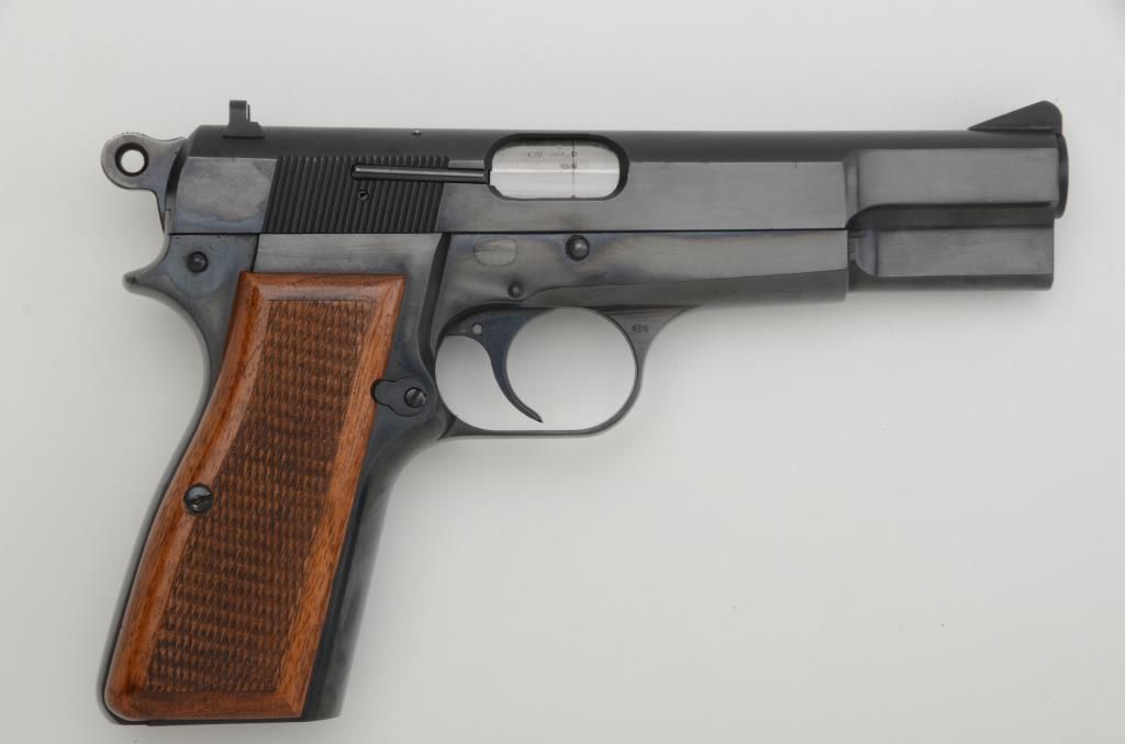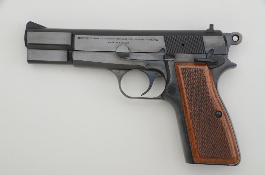 Belgian-made Browning Hi Power Model semi-auto pistol, 9mm cal., 4-3/4” barrel, no magazine, blue finish, checkered wood grips, #74C24383. This gun is in overall excellent condition showing the majority of itsoriginal finish, fine bore, action, markings and grips. Est.: $350-$700.