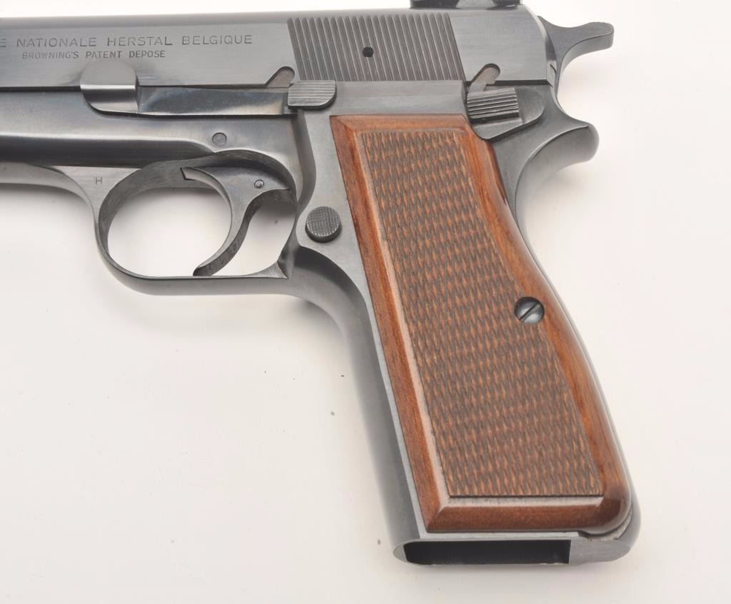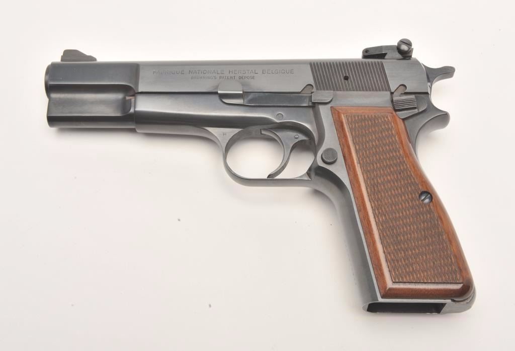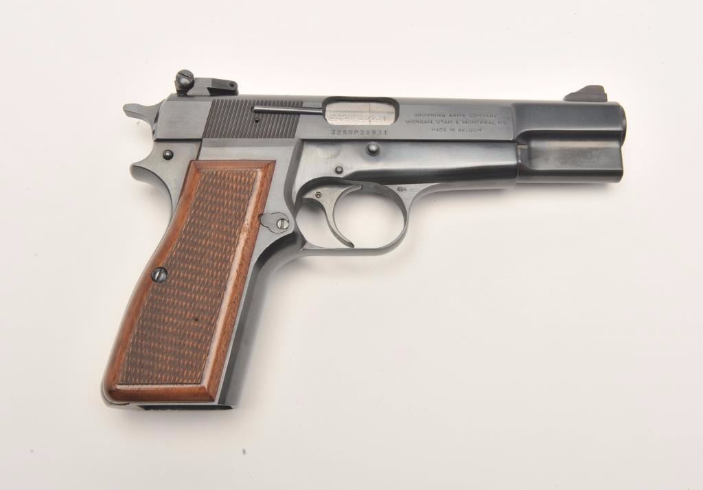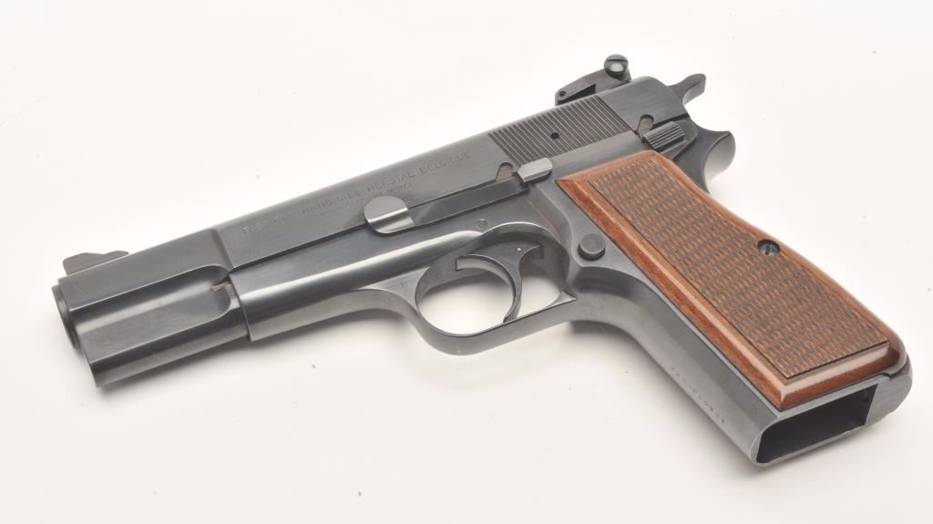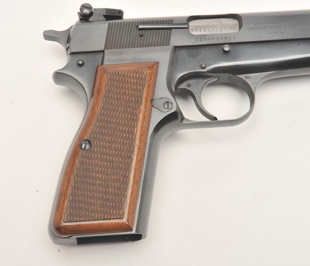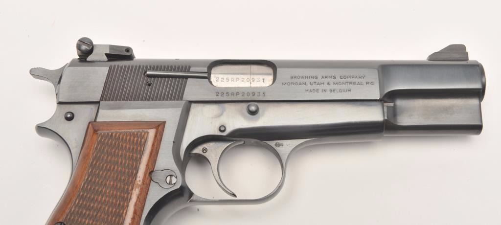 Belgian-made Browning Hi-Power semi-automatic pistol, 9mm caliber, 4.5” barrel, blued finish, checkered wood grips, no magazine, S/N 225RP20931, in overall fine condition showing the majority of its original finish,fine bore, crisp action, sharp markings with very good to fine grips. (Modern/PPT). Est.: $800-$1,600.