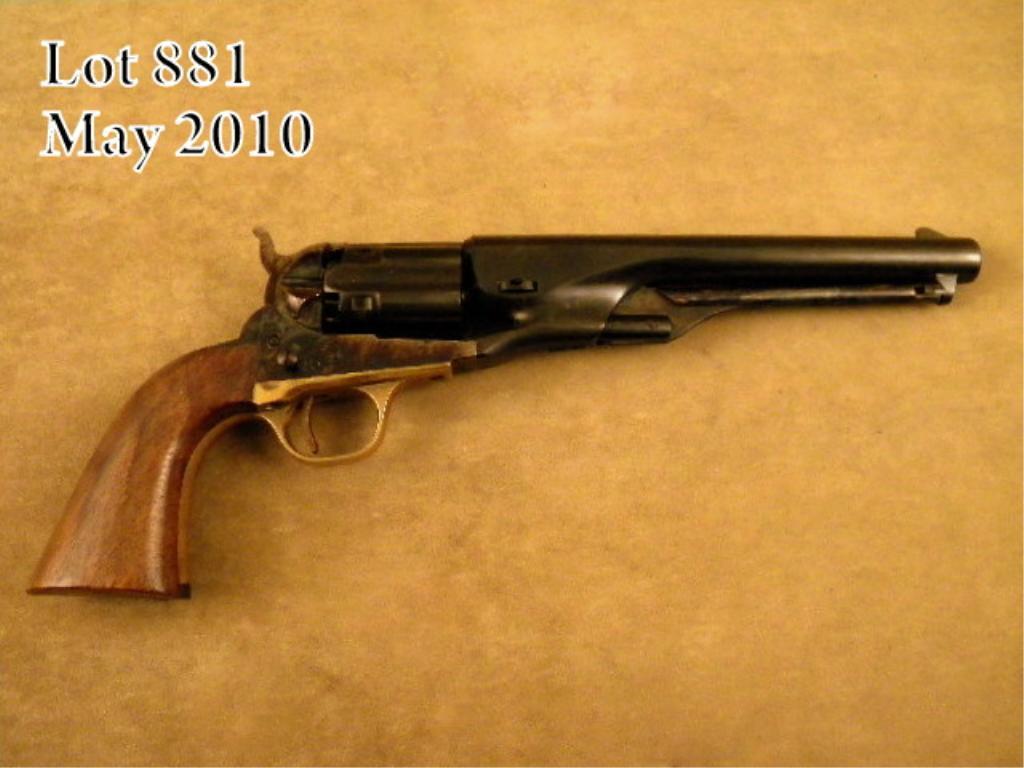 Belgian-made black powder reproduction of a Colt Model 1860 Fluted Army percussion revolver, .44 cal., 7-1/2” barrel, blue and case hardened finish, four screw variation, wood grips, #F741. This gun is in overall excellent condition showing little handling with Centennial Army .44 marked two-piece cardboard box with reproduction brass flask, iron bullet mold extra percussion nipple and brass tube wrench; small box of round lead balls. Est.: $150-$250.