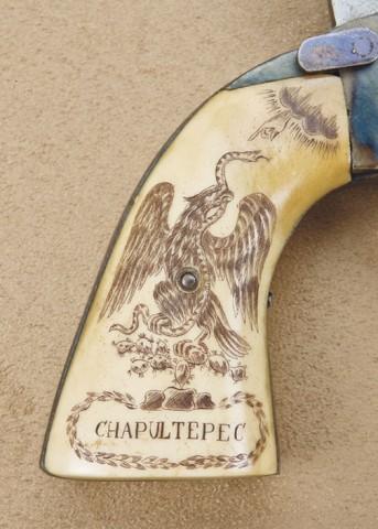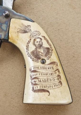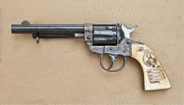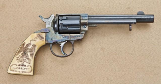 Belgian made copy of Colt lightning pistol, marked “Cowboy Ranger” on top of frame. Blue and case hardened finish, scrimshawed bone grips, left side of barrel marked “For .38 S&W special cartridges”. Serial #280. Made about 1910-15. The pistol remains in original very good to near fine condition with 90-95% bright blue and case hardening. Some small areas of light erosion and pinprick pitting, but generally near excellent overall. The cylinder pin shows some marks. There are some scratches on the barrel. Serial #28 on the bottom side of the barrel. The grips show incised scrim type work with a portrait of Mexican president with angel placing a wreath on his head, in a four line banner reads “Presidente Don Madero, 19 Februero, 1913.” The right side of the grips show a hand pointing from the clouds, the Mexican snake and eagle, and the word Chapultepec. The quality of the work on the grips is excellent and they are beautifully decorated. Est: $750 - 1500