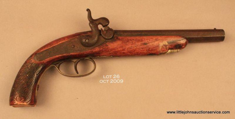 Belgian percussion single shot pistol, back action lock, approx. 60 cal., 6-1/2" octagon barrel, wood stock, #NVSN. This gun is in near relic condition but would make a great wall hanger; dark brown patina on metal parts, brass trigger guard, carved wood stock with butt plate missing, brass ramrod ferrule but ramrod missing. Est.: $75-$100.
