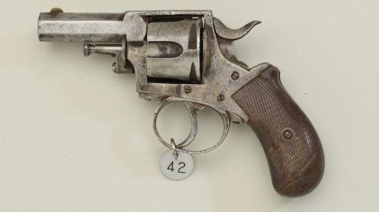 Belgian proofed DA revolver marked “STAR BULLDOG” on top strap, .41 cal., 2-1/2” octagon barrel, blue finish, checkered brown hard rubber grips with small star cast in bottom of both grips, #1100. This gun is inoverall fair condition showing a grey patina on the metal surfaces with scattered erosion and pin prick pitting; loading gate missing, fair bore, action not revolving cylinder and trigger return spring needs replacement;grips are worn with old scratches and mars from carry and storage; very unusual markings and interesting grips. Est.: $300-$500.
