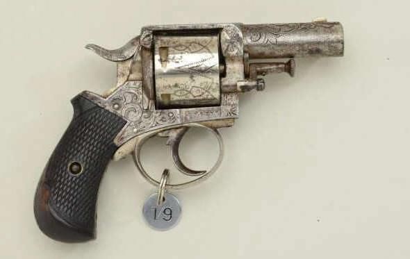 Belgian-proofed engraved Bull Dog DA revolver marked “EUREKA” on the top strap, .41 cal., 2-1/2” barrel, nickel finish, checkered wood grips, #NVSN. This gun is in overall good to very good condition showing approx. 25%original nickel finish with balance gone to a grey patina, scroll and punch dot period engraving, good action and markings, bore should clean to good; grips are overall good with some scattered wear and a dime-sized old mar on the right lower portion of the grip; a desirable variation to the classic bull dog revolver that was popular during the mid-to-late 1800’s. Est.: $700-$1,400.