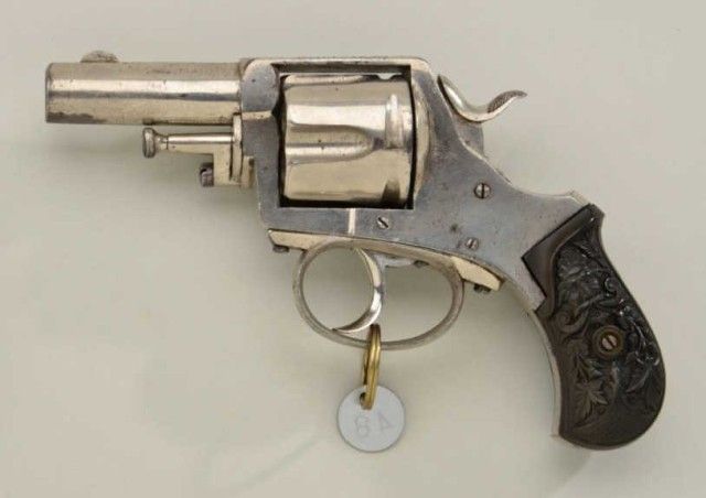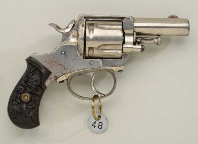 Belgian-proofed large frame DA revolver with rare marking on top strap “CALIFORNIA BULL-DOG, .41 cal., 2-1/2” barrel, nickel finish, fancy molded floral style black hard rubber grips, #NVSN. This gun is in overallvery good condition showing the majority of its original finish, good bore and markings, very good deluxe grips; action needs work as trigger is working but not rotating the cylinder; unusual marking and size in a BullDog revolver. Est.: $750-$1,500.