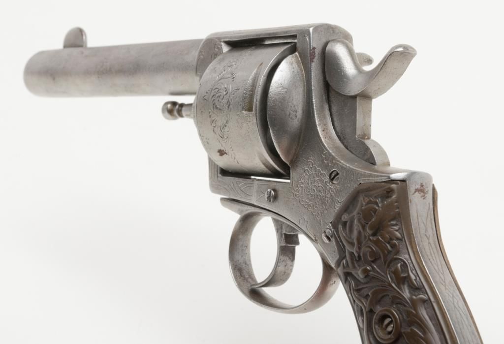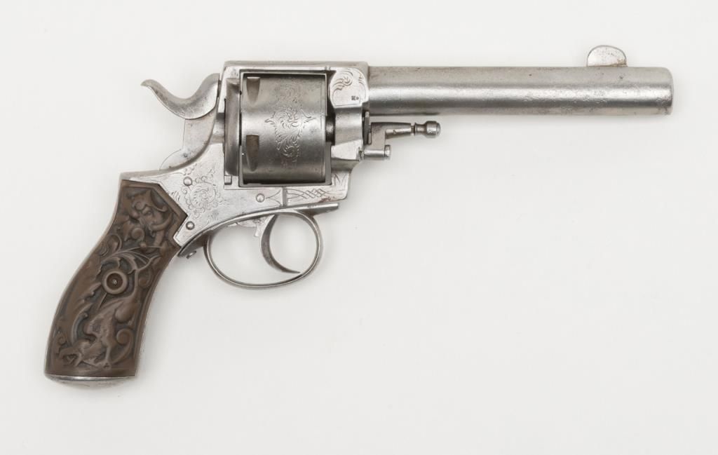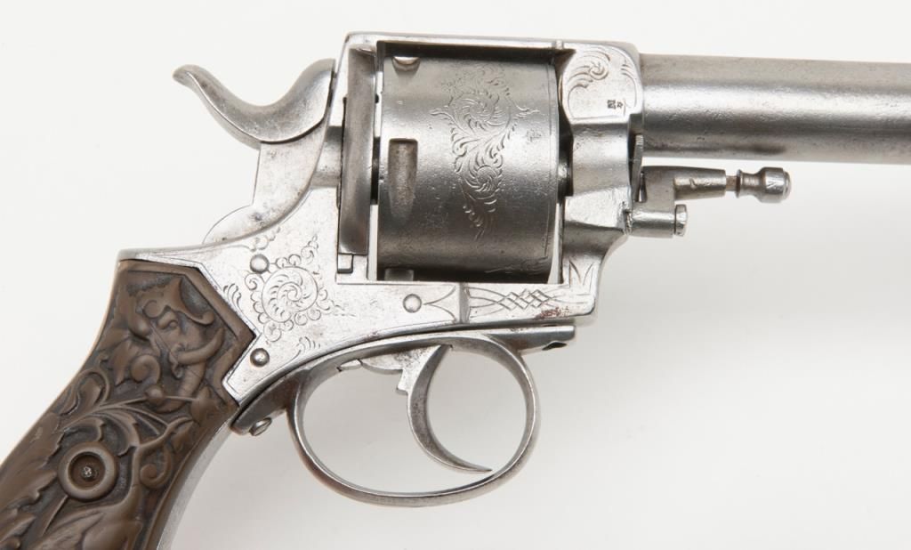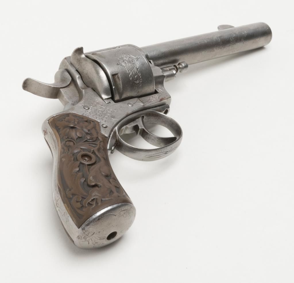Belgian proofed large frame English Webley and Scott DA revolver marked “British Constabulary” on top of frame, .455 cal., 5-1/2” barrel, brown floral with mythical griffin hard rubber brown grips, #NVSN in overall fair to good conditionshowing an old cleaning with light patina returning to metal surfaces that show period engraving and scattered light areas of pitting; working action, fair bore, worn but complete grips, lanyard ring and base missing. (Antique). Est.: $200-$400.