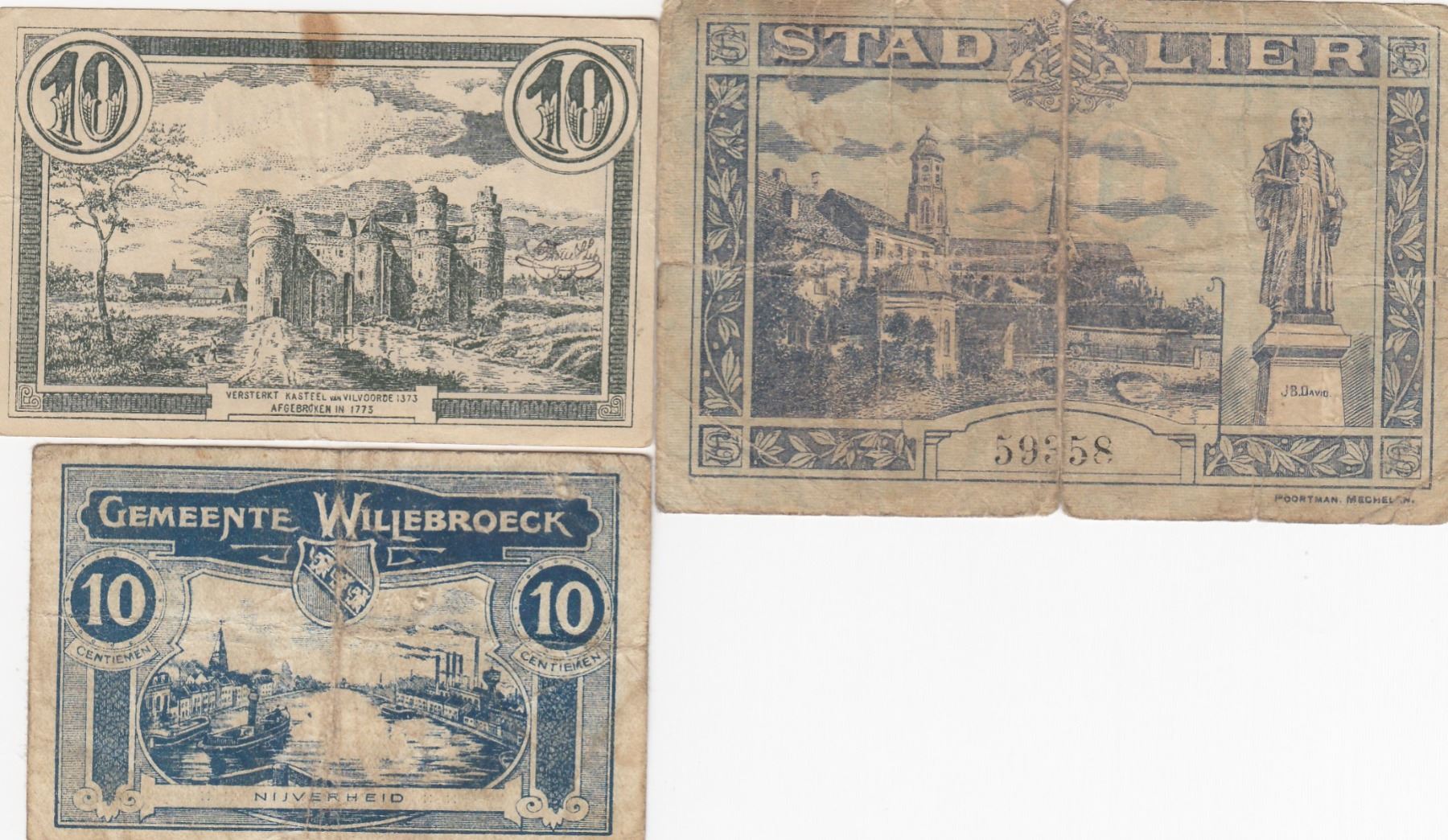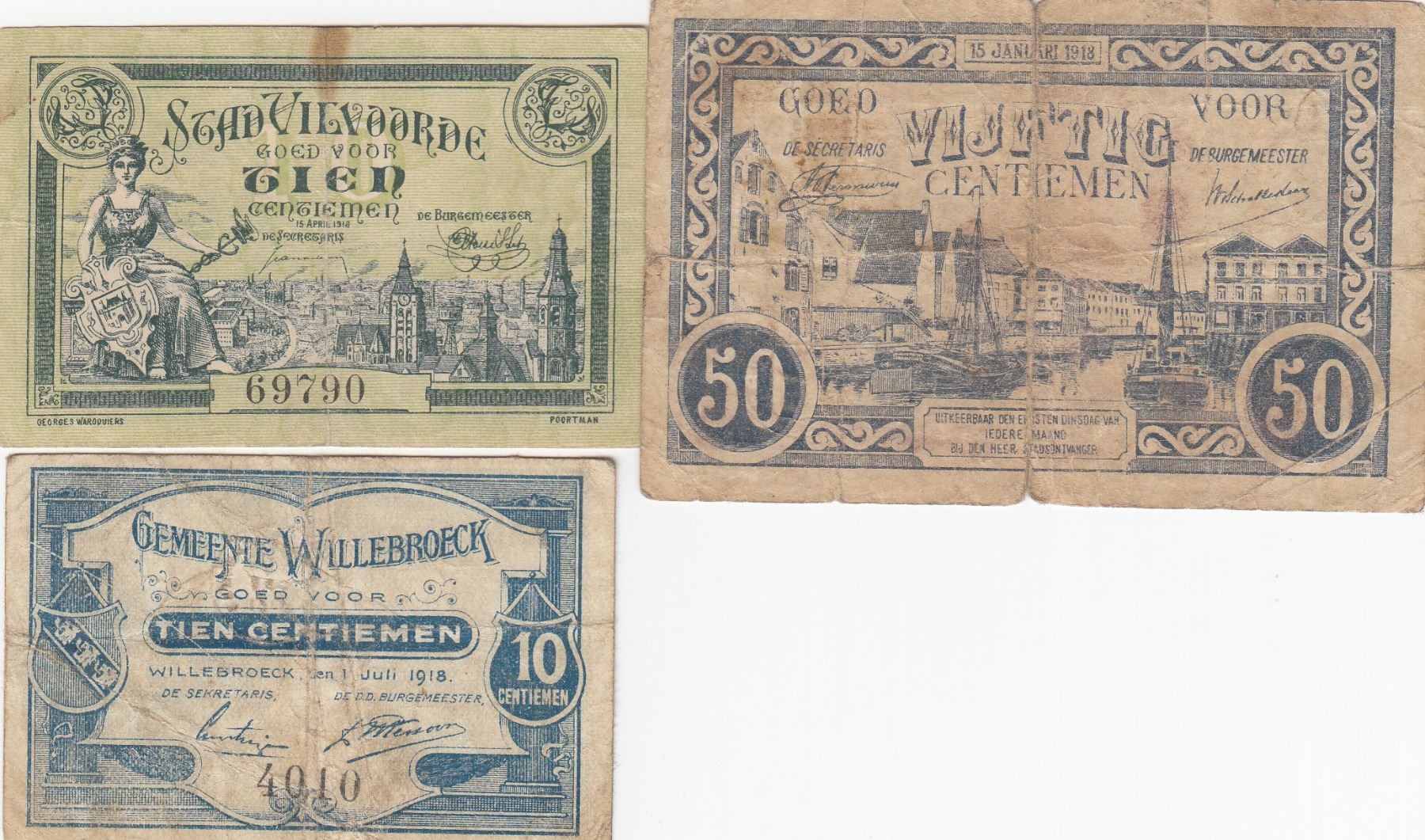 Belgium, 10 Centimes (2), 50 Centimes, 1918, FINE / XF, (Total 3 bankotes)br/