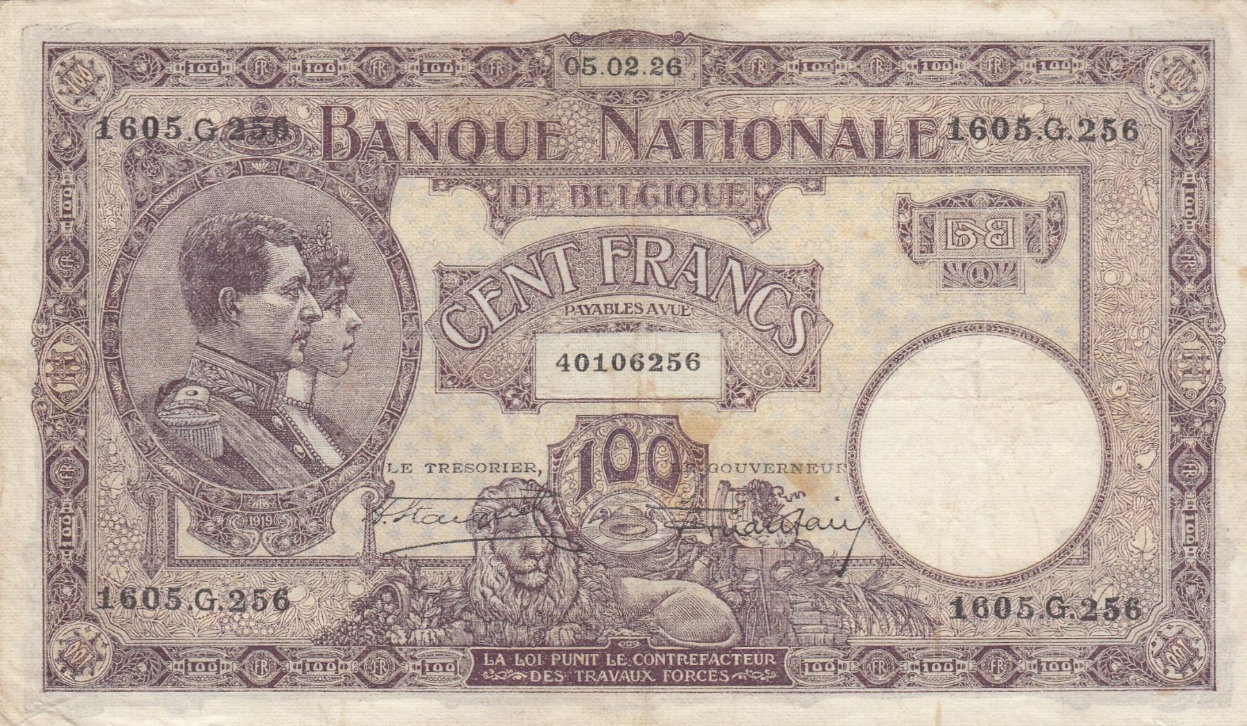Belgium, 100 Francs, 1926, VF (+), p95br/serial number: 1605.G.256