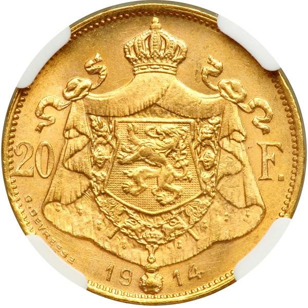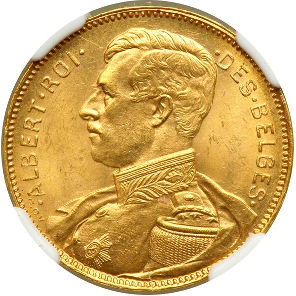 Belgium. 20 Francs, 1914. Fr-421; KM-78. Weight 0.1867 ounce. French - Postition A. Uniformed bust of King Albert. NGC graded MS-65.