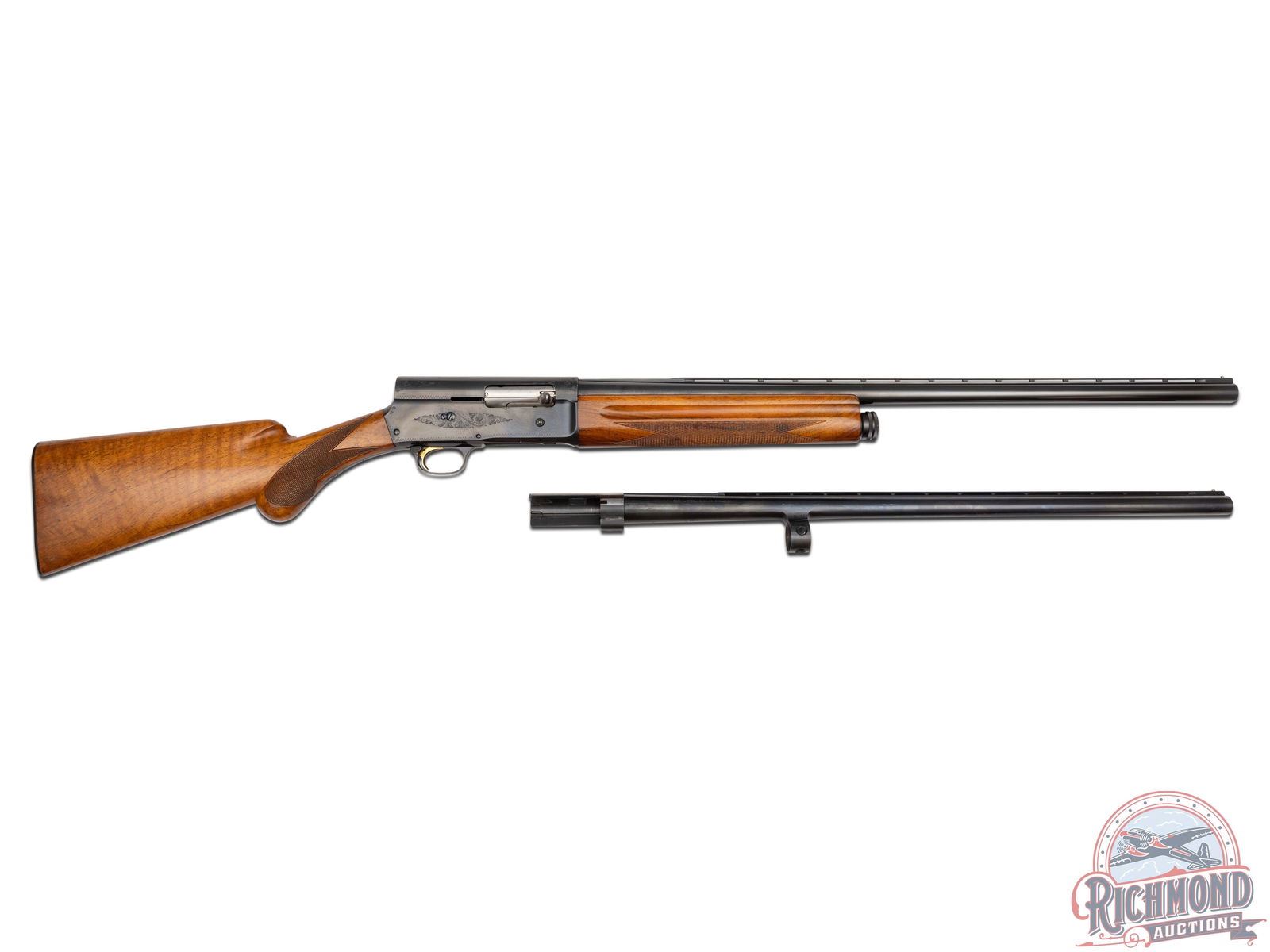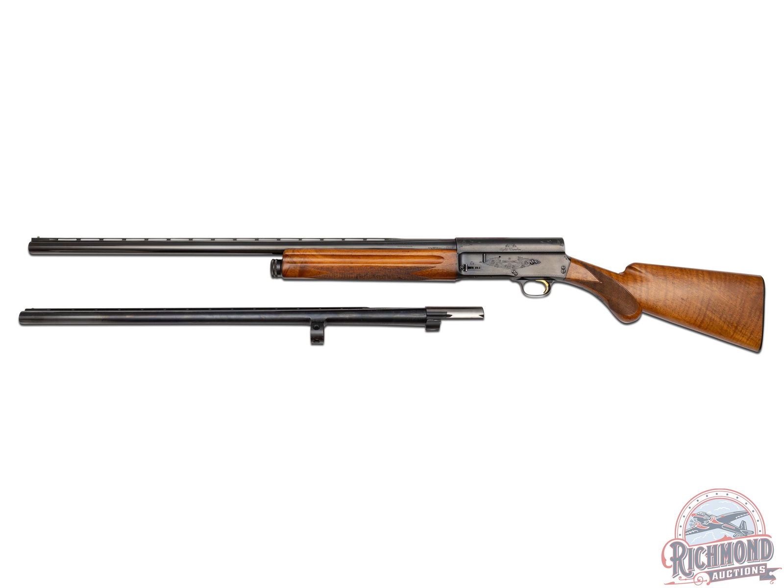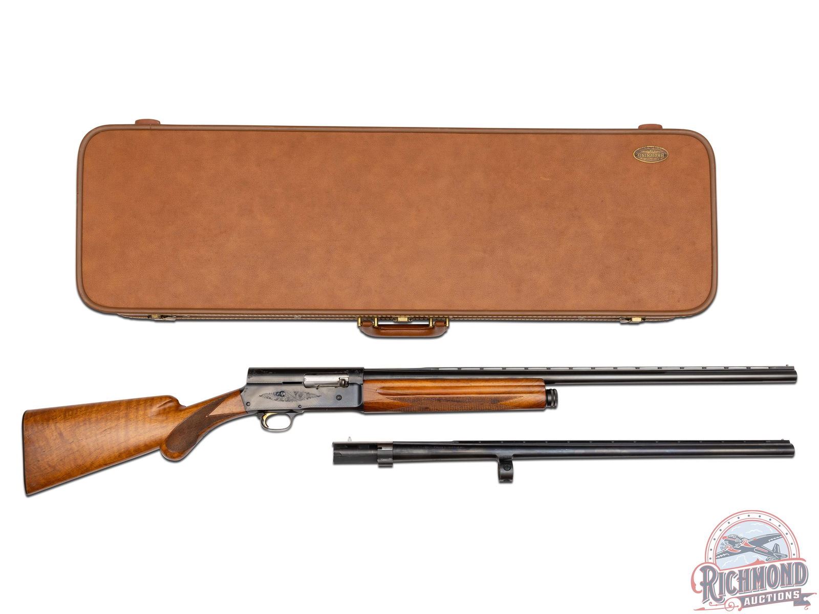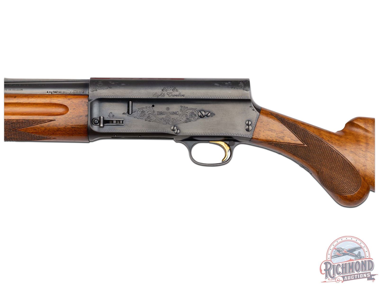 Made in Herstal, Belgium by Browning in 1966. 28" blued barrel with ventilated rib, bead front sight, 2-3/4" chamber, modified choke, and marked with Browning St. Louis and Montreal Addresses. Matching configuration 26" barrel only with Improved cylinder choke. Blued action with "Light Twelve" marking on left side and standard gold washed trigger and Grade I floral engraving pattern. Light tone walnut long tang round knob checkered pistol grip stock with "FN" marked butt plate. Matching checkered walnut forearm. Comes in fitted Browning luggage trunk case with original papers. LOP: 14-1/4". DAC: 1-1/2". DAH: 2". CALIBER: 12 GA. S/N: 6G61550. FFL STATUS: Curio & Relic.
