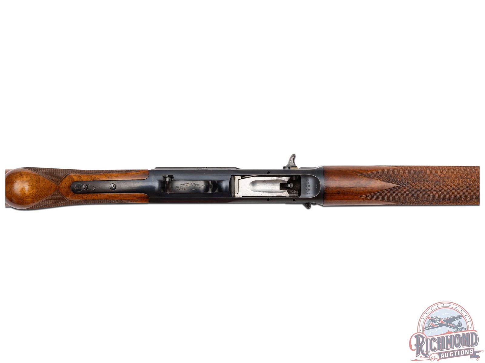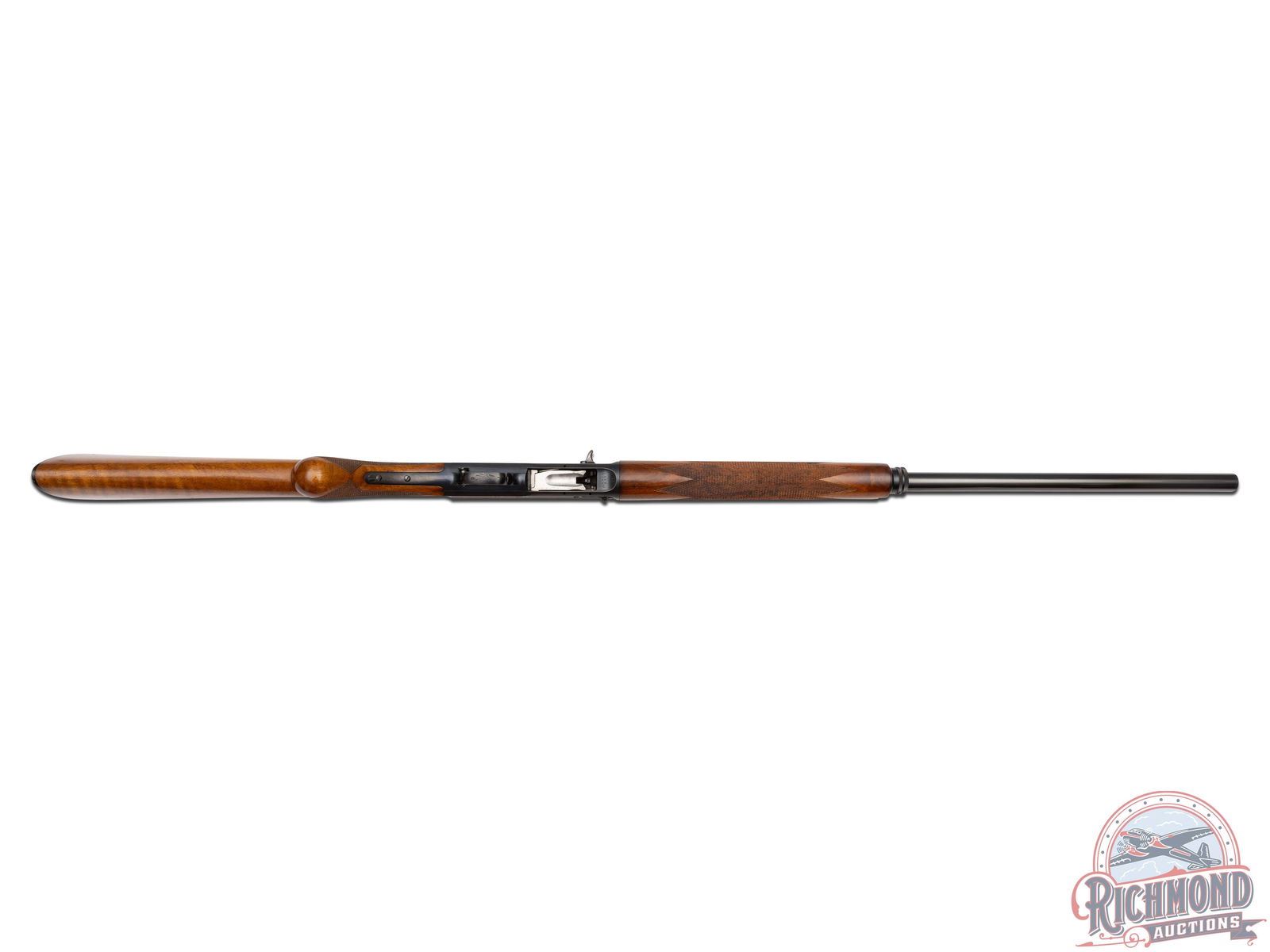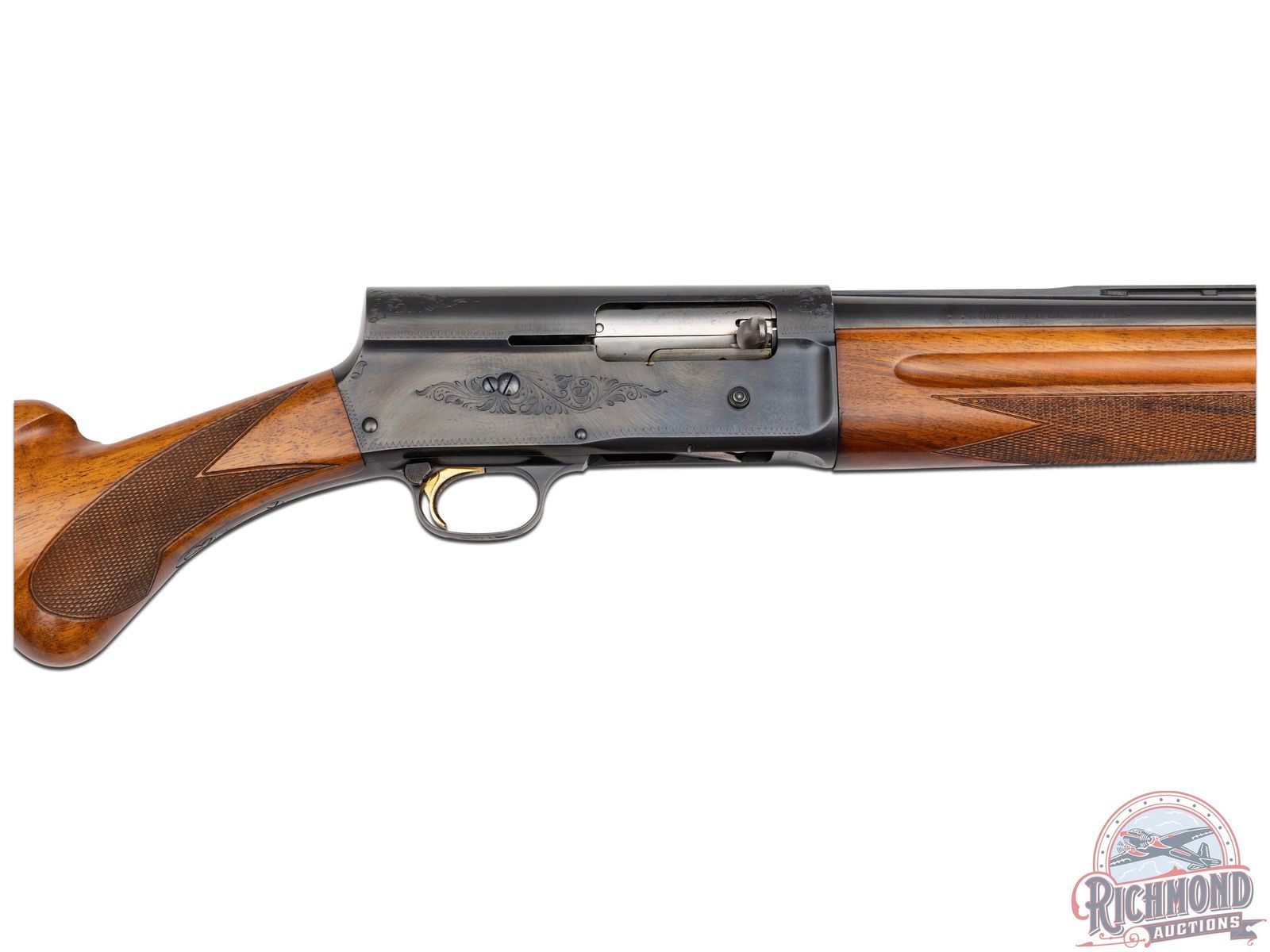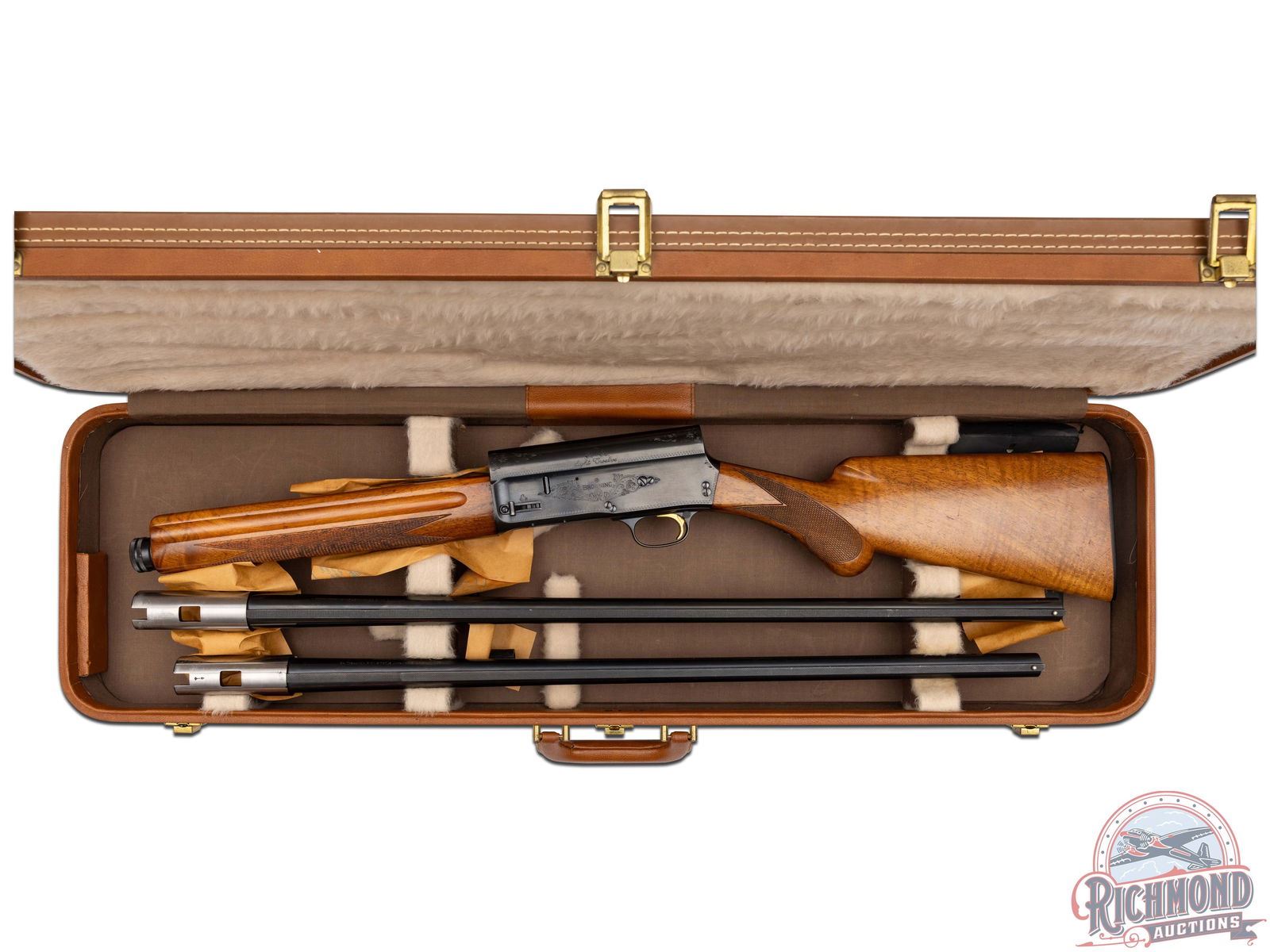 Made in Herstal, Belgium by Browning in 1966. 28" blued barrel with ventilated rib, bead front sight, 2-3/4" chamber, modified choke, and marked with Browning St. Louis and Montreal Addresses. Matching configuration 26" barrel only with Improved cylinder choke. Blued action with "Light Twelve" marking on left side and standard gold washed trigger and Grade I floral engraving pattern. Light tone walnut long tang round knob checkered pistol grip stock with "FN" marked butt plate. Matching checkered walnut forearm. Comes in fitted Browning luggage trunk case with original papers. LOP: 14-1/4". DAC: 1-1/2". DAH: 2". CALIBER: 12 GA. S/N: 6G61550. FFL STATUS: Curio & Relic.