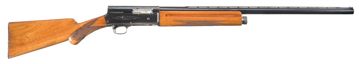 Manufactured in Belgium with a single brass bead on the matte vent rib and choked full. Standard Fabrique Nationale barrel marking and standard floral scroll and zigzag engraving on the receiver also marked "BROWNING" on the left side. Mounted with a varnished checkered walnut forearm with finger grooves and round knob pistol grip stock with early Browning horn buttplate.