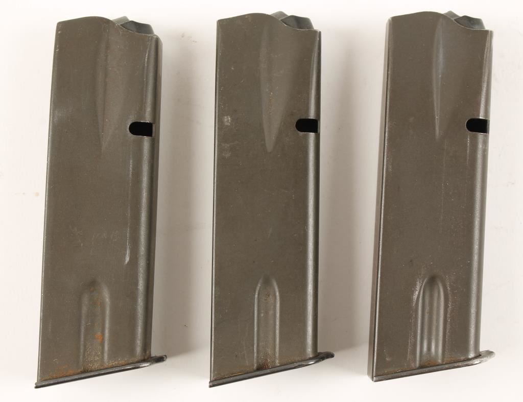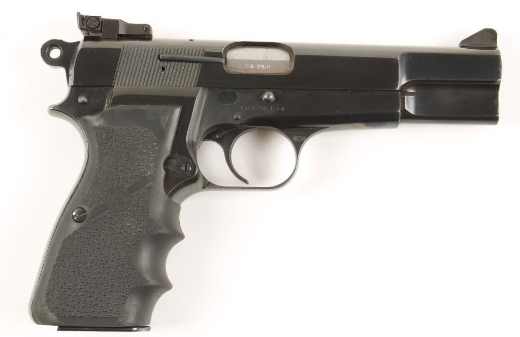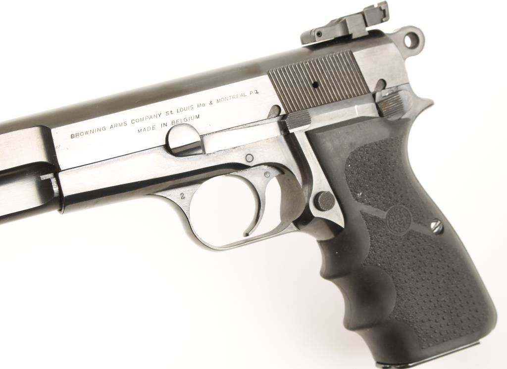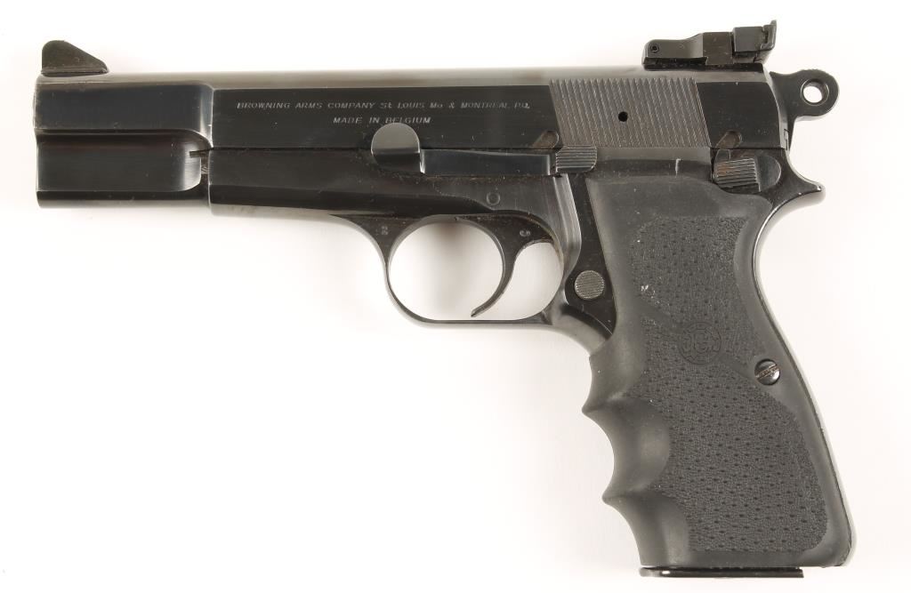 Blued single-action semi-automatic Belgian made pistol with a 4-3/4" barrel and four magazines. Rear sight adjustable for windage and elevation. The finish is nearly flawless with only tiny areas of pitting on the left and right sides of the slide near the muzzle and one scratch above the left grip. The bore is immaculate. Has Hogue finger groove grips installed. Includes 4 mags. Condition is very good. *Modern Firearm*