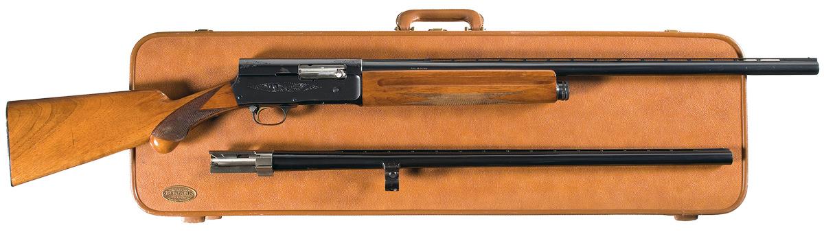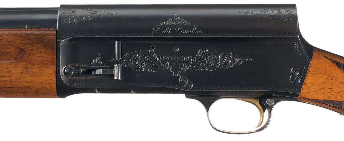 Manufactured in Belgium 1957 with two 12 gauge barrels. Each barrel features a single bead sight on a vent rib, 2 3/4" chambers, and choke marked modified (**). The receiver is decorated with light floral patterns and marked "Light Twelve" in script at the top left side and "BROWNING" over the bust of John Browning. Checkered forearm and round knob pistol grip stock with horn FN buttplate. Complete with a Browning takedown case.