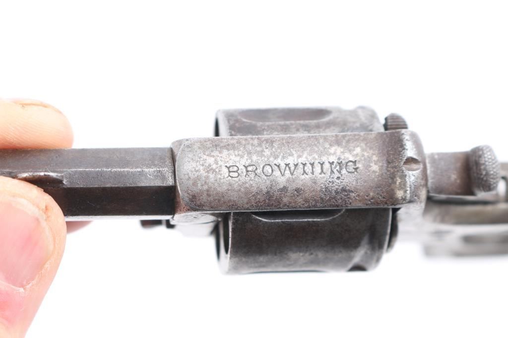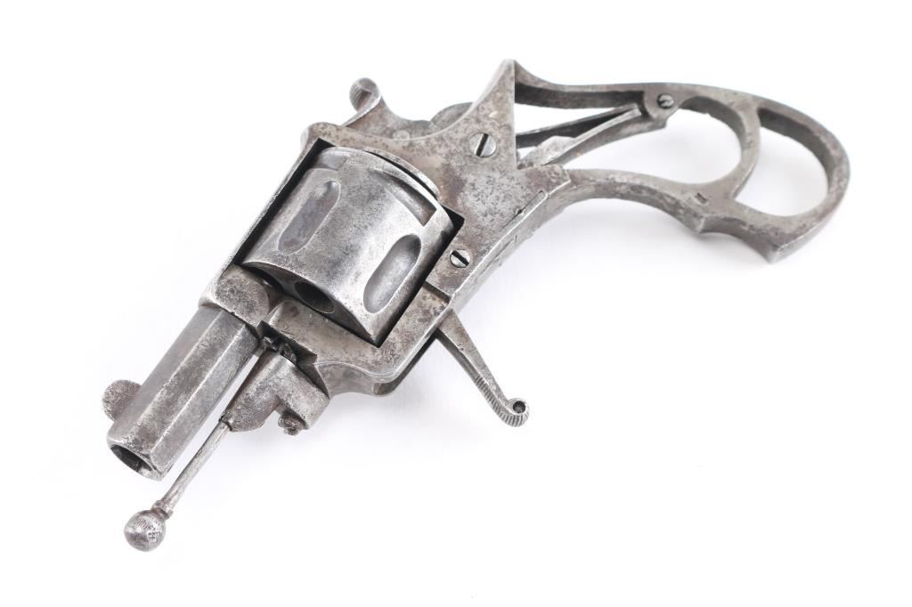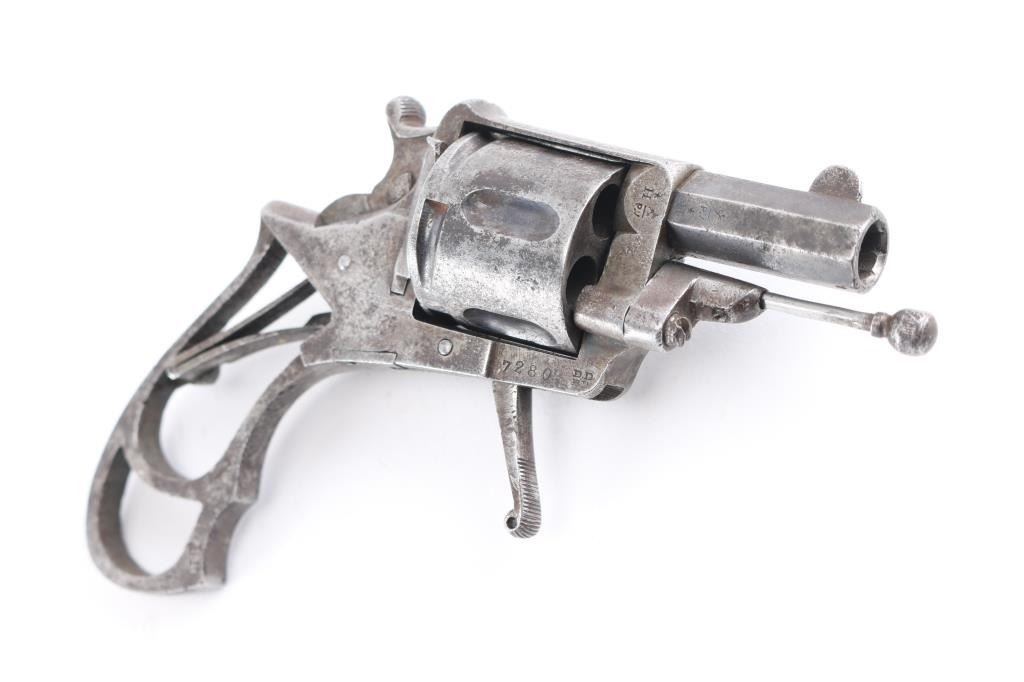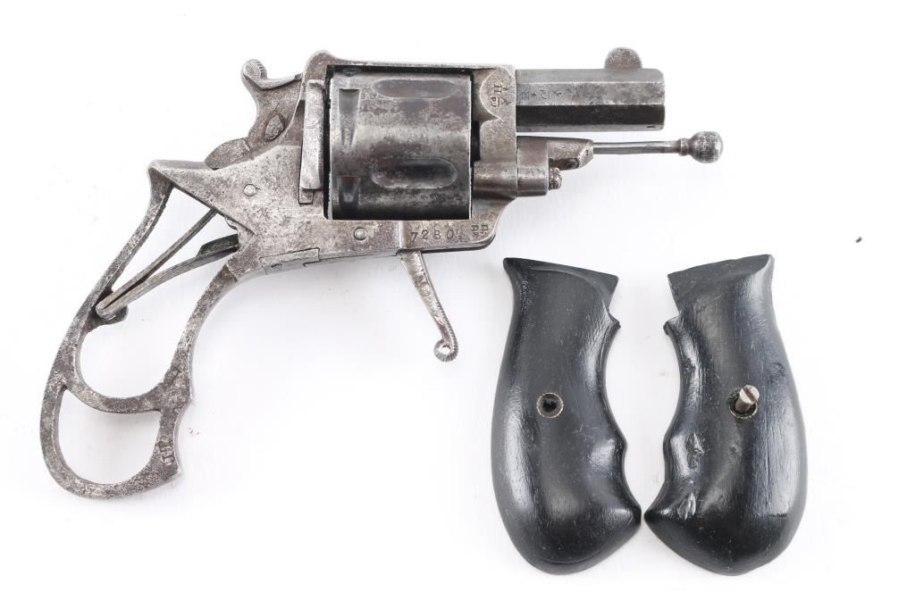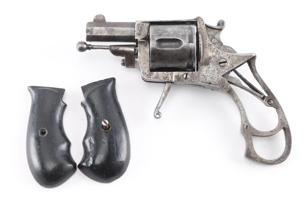 European D. A. Folding Trigger revolver with Belguim proofs and frame marked "Browning" on the top. 32 center fire. Finger grooved front of frame. Fair to good overall condition. Action not working. Grips will not keep together with screw. Larry Shelton Collection, who thought the Browning marking to be A. Browning of North Cal. who sold it as an agent in 1880s - 90s.Condition is NRA Fair***Antique Firearm***