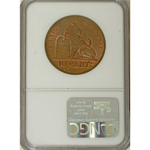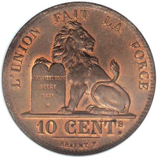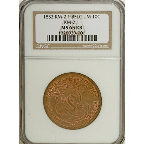 <B>Leopold I 10 Centimes 1832, </B></I>KM2.1, MS65 Red & Brown NGC, coin alignment, a superb example with glowing red and orange mint brilliance. Early copper coins with this appearance are highly sought after!<BR><BR><b>Shipping:</b> Coins & Currency (<a target="_blank" href="http://www.heritageauctions.com/common/shipping.php">view shipping information</a>)