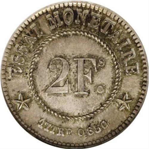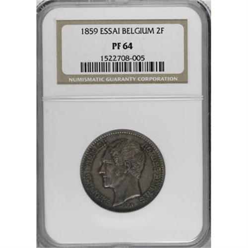 <B>Leopold I Silver Pattern 2 Francs 1859,</B></I> unlisted in KM but similar to KM-Pn54 and 55, Proof 64 NGC, deeply toned and very attractive. Rare and desirable Essai Monetaire.<BR><BR><b>Shipping:</b> Coins & Currency (<a target="_blank" href="http://www.heritageauctions.com/common/shipping.php">view shipping information</a>)