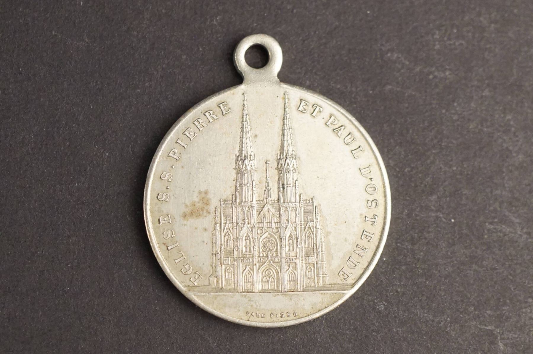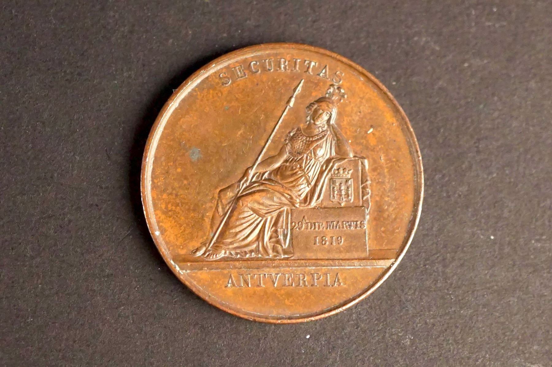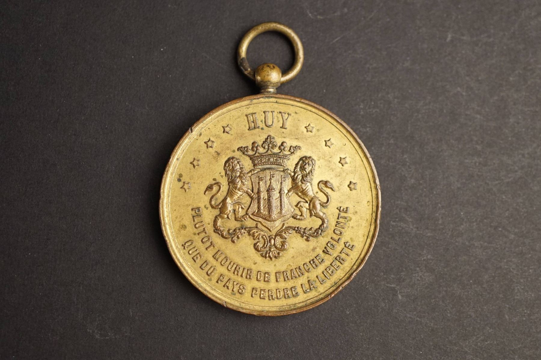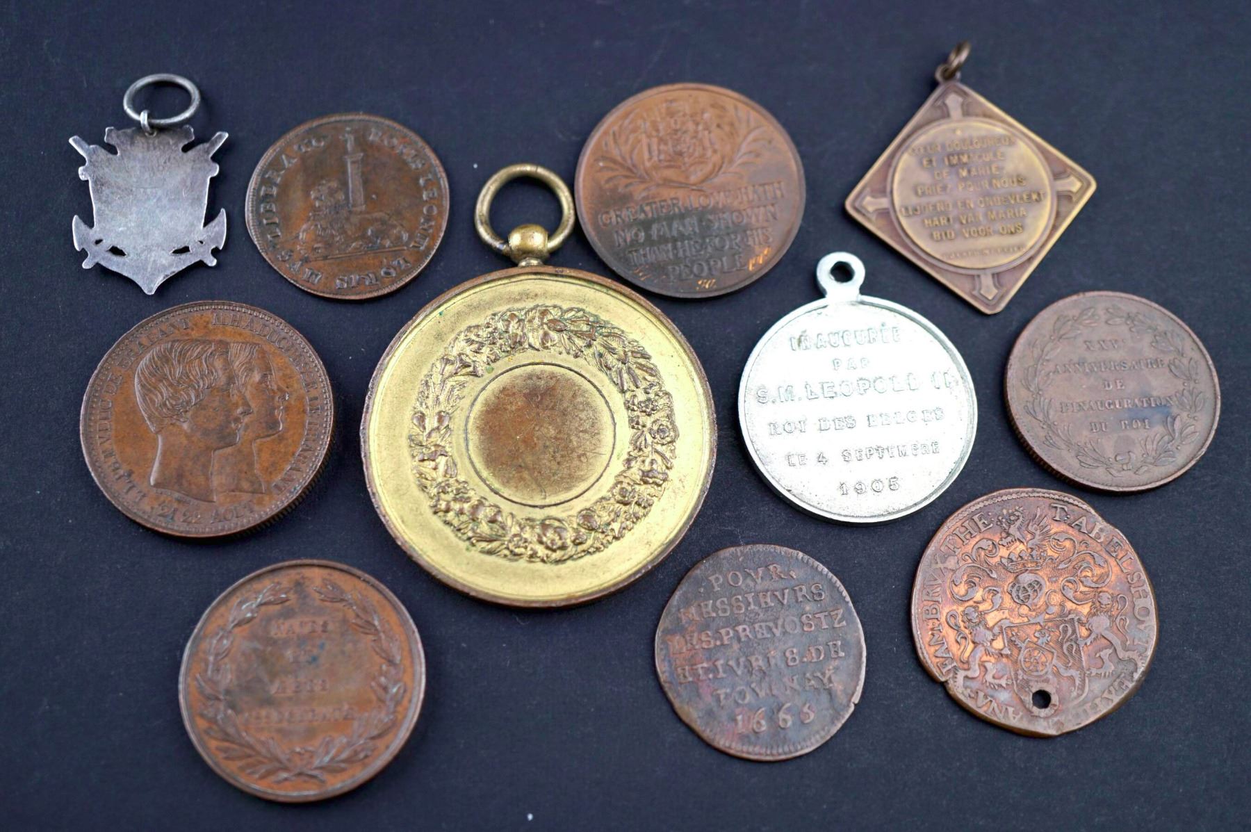 1) Town of Huy, Large suspension medal, gilt bronze, 45 mm. HUY above city arm. Below in two lines : PLUTÔT MOURIR DE FRANCHE VOLONTÉ QUE DU PAYS PERDRE LA LIBERTÉ. Reverse: Thick wreath around empty central circle. 2)Obverse: LEOPOLD PREMIER ROI DES BELGES 1853, Bust, left. Reverse: Marriage of Duke and Duchess. Their conjoined busts, Bronze, 32 mm. AU. 3) Bronze 28 mm, 25th anniversary of the crowning of Leopold I. 1866. 4) Copper, 29 mm. The Security of Antwerp March 29, 1819 AU. 5) Copper medalet, City of Bruxelles, 17-18th century. Pierced. 6)Copper 26 mm, dated 1665. 7) Copper, 27 mm, Uncertain origin. Little wear but bent. 8) and 9) Two Post WWI medalets of Cardinal Mercier; one round, 31 mm, one square 25mm suspended from a corner, both EF-AU. 10) Église de St. Pierre et St. Paul. Ostende, inauguration by the king, 1905, Loop for suspension. Copper-nickel. 11) Sport Nautique de Bruxelles Small Silver Pendant, uniface. Crowned city shields, on crossed anchors, with suspension loop. 24 mm.