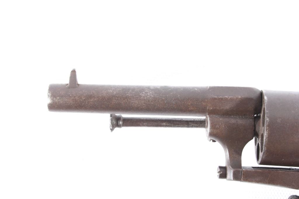 This lot features a Belgium Proofed .32 Caliber Pinfire Revolver. The revolver features a 3 3/8" barrel, loading gate, folding trigger, extractor, six shot cylinder, and walnut grips. This revolver shows good consition for its age. It has wear to the finish and signs of use. The mechanics function well, but the trigger return spring appears to not function. The bore shows some darkness, with strong rifling. This is a antique firearm. NO FFL transfer or NICS background check required. NO serial number.