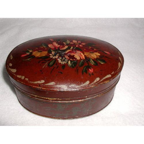 Pretty oval tin from Belgium C.1875 has hand painted floral motif on the lid using vibrant colors in wonderful condition. The lid is hinged on one side. Background color of brown shows small spots of worn paint on both sides. Good size for storing multiple items. Measures 6L X 2.5H X 4.5D.