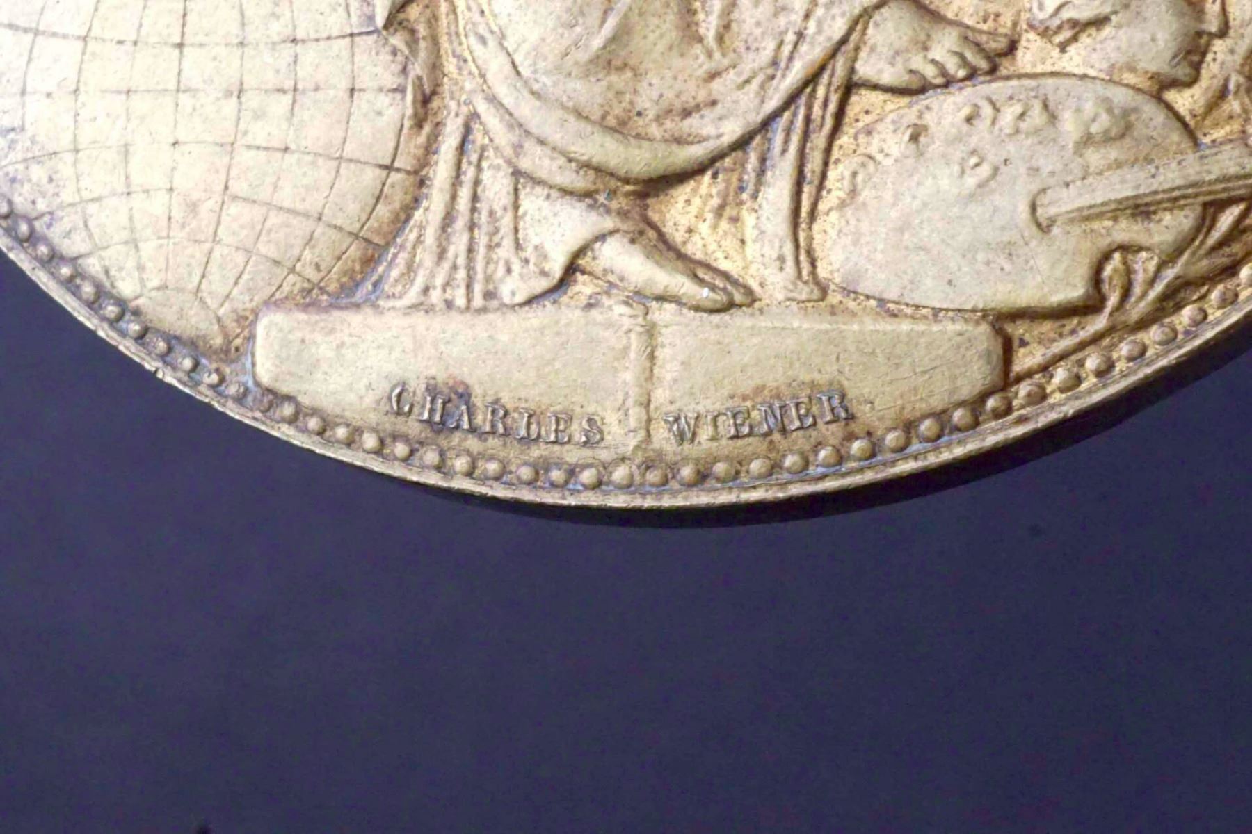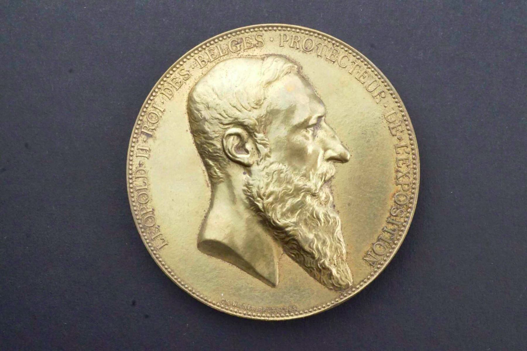 "LEOPOLD II ROI DES BELGES PROTECTEUR DE L'EXPOSITION" Bust, right.Signed: CH. WEINER BRUXELLES. Reverse:EXPOSITION UNIVERSELLE ANVERS 1885. Complicated Art Nouveau design, signed CHARLES. WEINER. At left, a semi-nude young woman, seated on a globe. to right, a nearly nude young boy, holding a branch and a wreath. Symbols of Art, Music, Industry, Obverse cleaned, polished. Reverse as new. Yellowish bronze, 60 mm, 110.7 grams.
