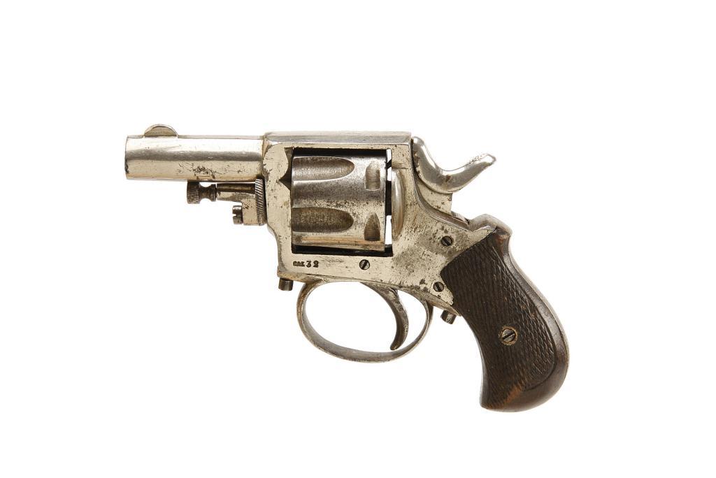 Condition: Good with some wear to the frame.Early 6 shot double action pocket revolver probably made in Belgium. Nickel finish, checkered wood grips, 2" barrel with fixed sight, fair bore and action needs some work. Condition: Good with some wear to the frame.