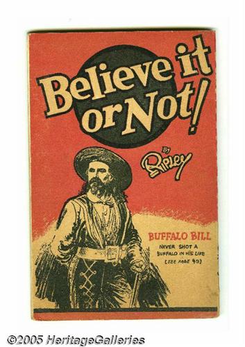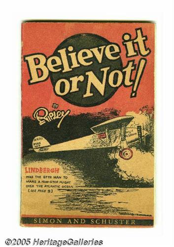 <B>Believe It Or Not! by Ripley #nn (Simon and Schuster, 1929) Condition: VF.</B></I> This Platinum Age artifact is a first printing, followed by many reprintings. The newspaper strip began in 1918 and is still running. Robert Ripley was already a newspaper phenomenon and a bestselling author when he released this collection of amazing facts. Doubtful you will find a nicer copy. 64 pages, paperback. Overstreet 2005 VF 8.0 value = $240. <I>From the collection of Chris Bell.</B></I>