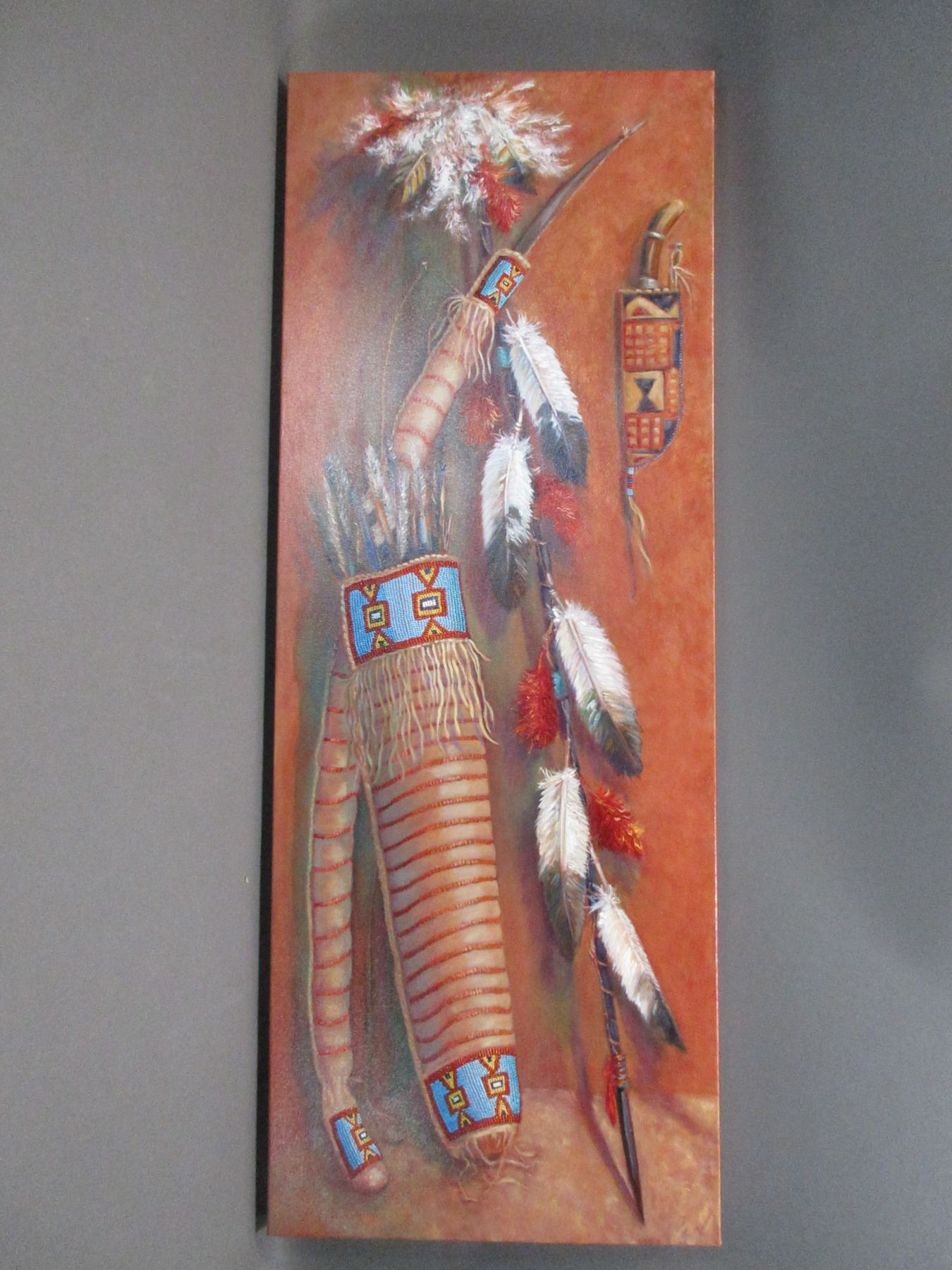 Believed To Be Original Signed Mary LeMessuries 2018 Picture On Canvas- Sioux Bow And Quiver 1860's- Lance 1890's- Parfleche 1890's- 48" X 18"