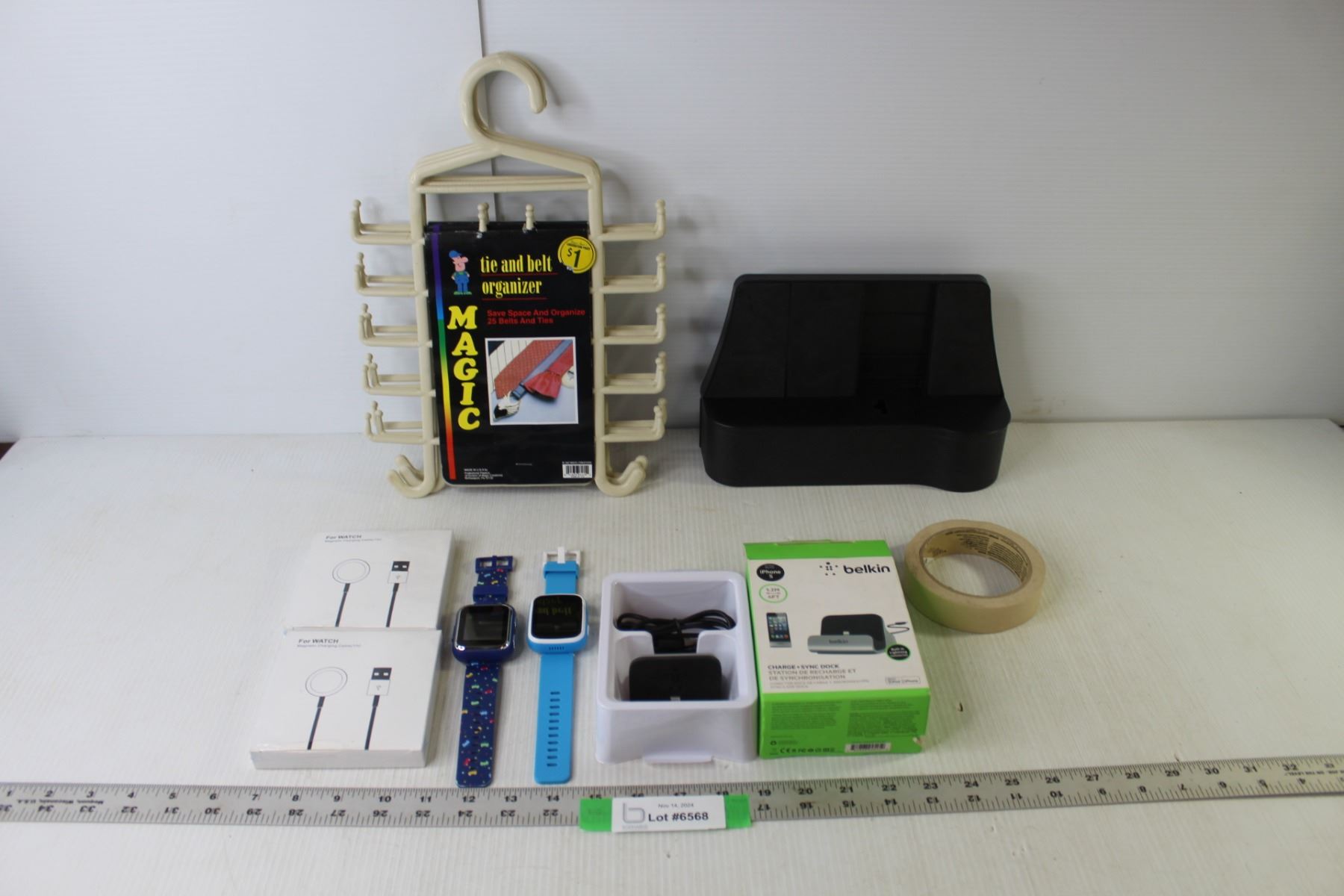 Belkin iPhone 5 Charge & Sync Dock (NIB), (2) iTouch Watches, (2) Magnetic Charging Cables (NIB), Car Seat Organizer, (3) Tie & Belt Organizer Hangers