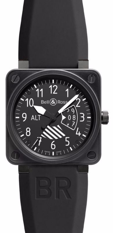 Model: BR0196-ALTIMETER - CASE = [Material:Steel case with matte black PVD finish], [Case Diameter:46], [Bezel:Fixed], [Case Back:Skeleton], [Water Resistant:100 Meters - 330 Feet], [Crystal:Scratch Resistant Sapphire],; DIAL = [Color:Black. Date window at 3 o'clock. Hands, index markers and dat window covered in a photo-luminescent coating.],; MOVEMENT = [Type:Automatic Self Winding], [Crown:Screw Down],; BAND = [Clasp:Tang], [Type:Black Rubber and Heavy Synthetic Fabric], (Usually ships in 2 to 4 weeks.)